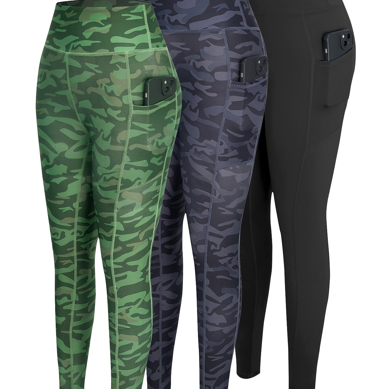 3pcs Set Women'S Plus Size Daily Sports Yoga Leggings, Geometric Pattern, High Stretch Spandex, Breathable, with Two Side Pockets, for Running, Workout