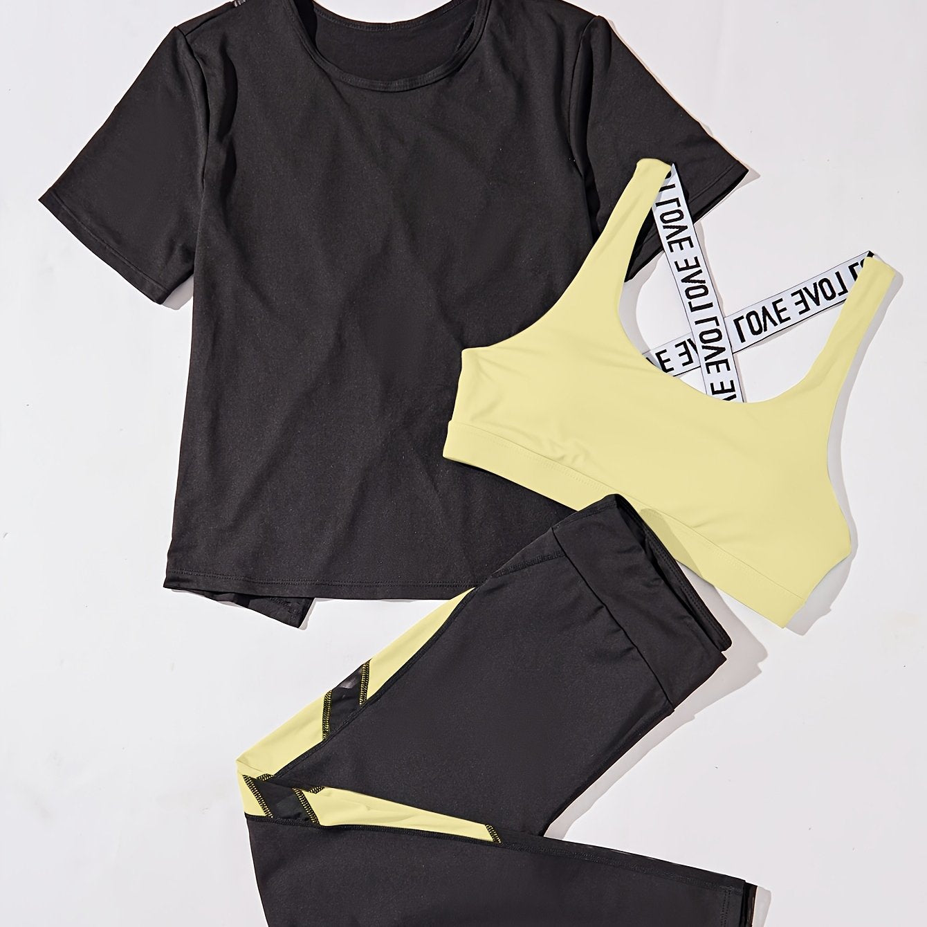 3pcs Women's Yoga Set in Black & Purple - High-Stretch, Sleeveless Sports Bra with Crisscross Straps, Short Sleeve Top & Leggings - Polyester & Elastane Blend, Machine Washable