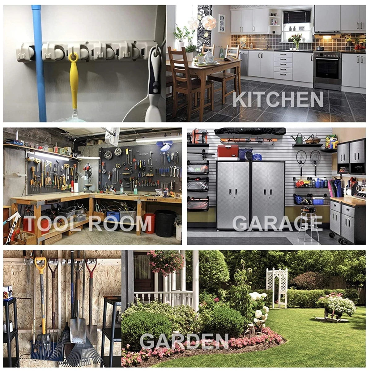 • FOR INDOORS OR OUTDOORS Tidy up any of your brooms, mops, rakes, shovels, cleaning, gardening supplies with just one tool organizer. Our broom hanger is perfect for the kitchen, closet, garage, office or commercial use. Thanks to its weatherproof design, our holder can even be used outdoors or on the shed for your garden tools.