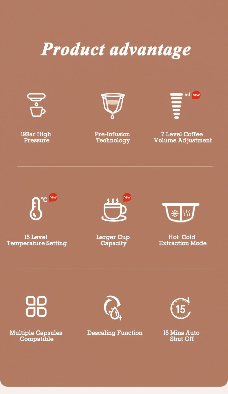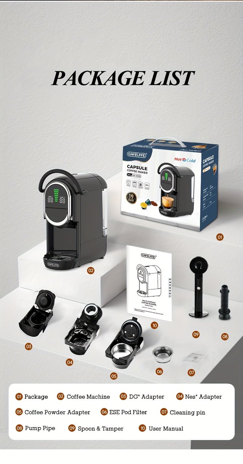 CAFELFFE 4-in-1 Capsule Coffee Machine | 19 Bar Espresso Maker | Smart Temp Control & 7 Preset Brewing Times | Compatible with Nes/DG/ Capsules Ground Coffee/ESEpod | Premium Gift Set for Coffee Lovers & Family, Automatic Esp