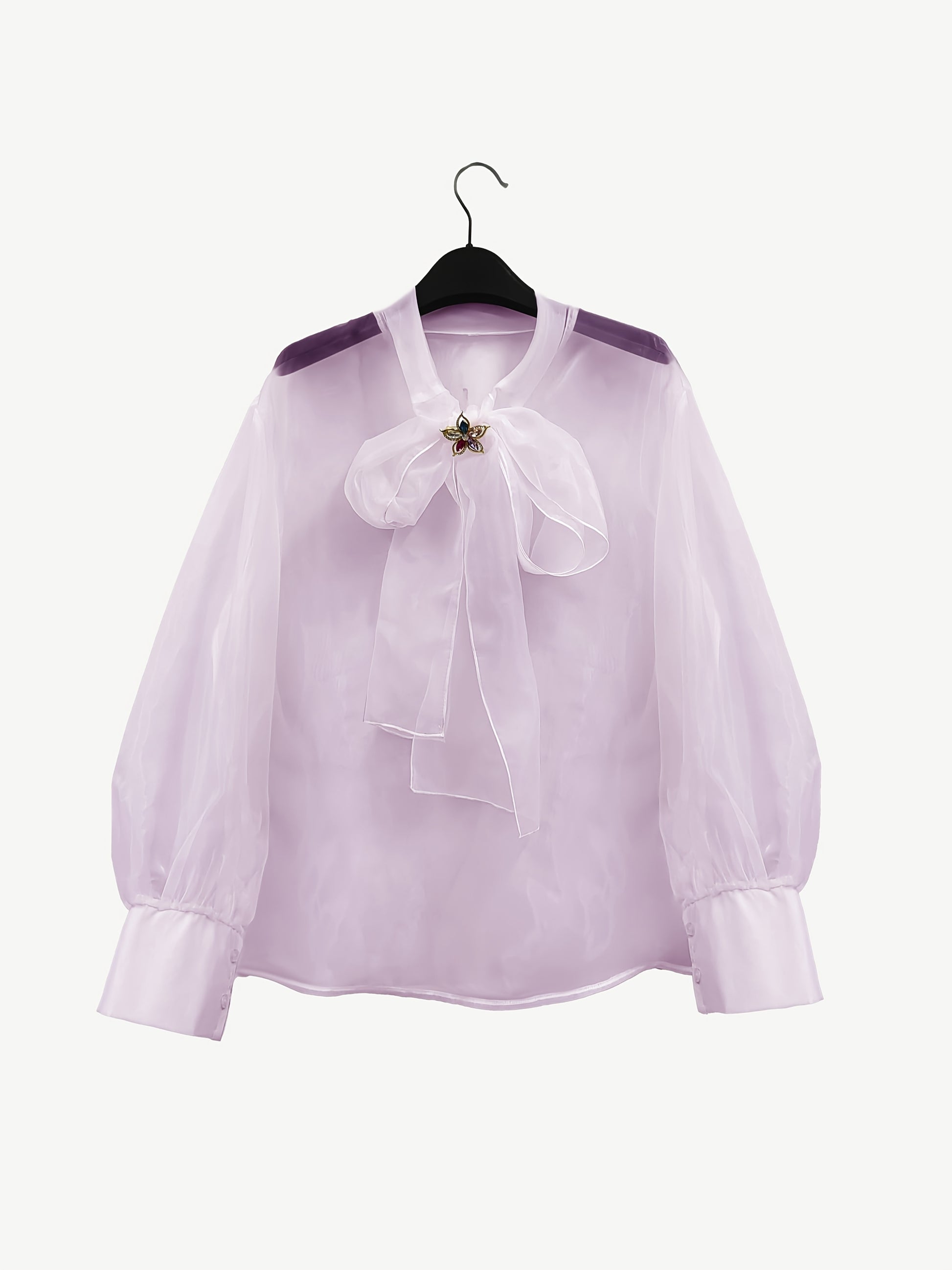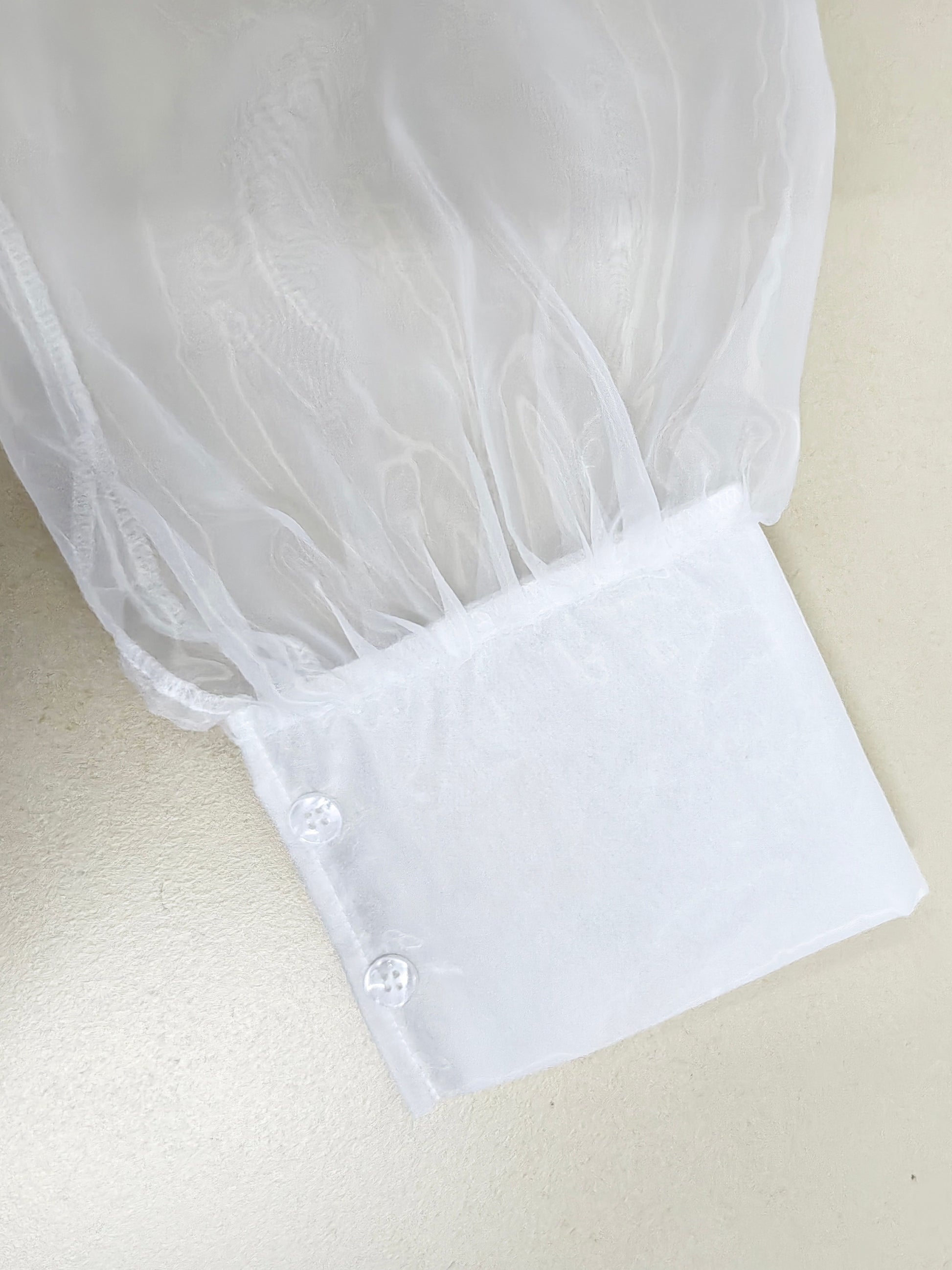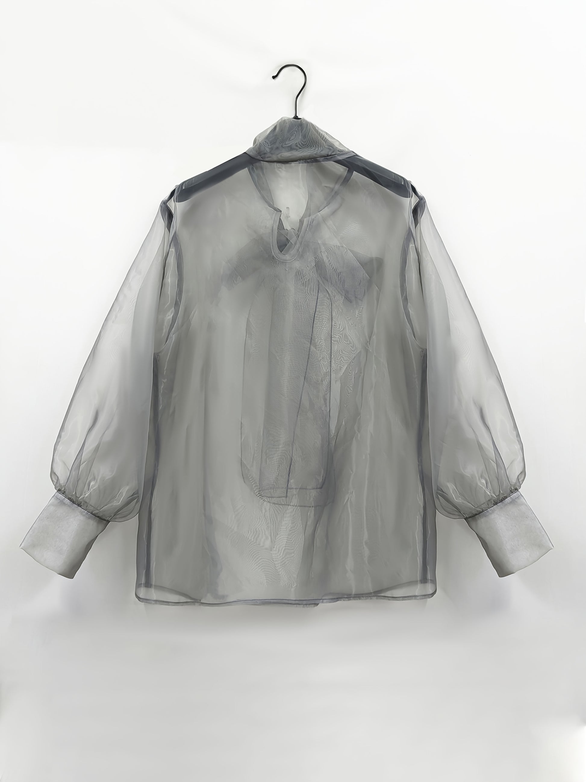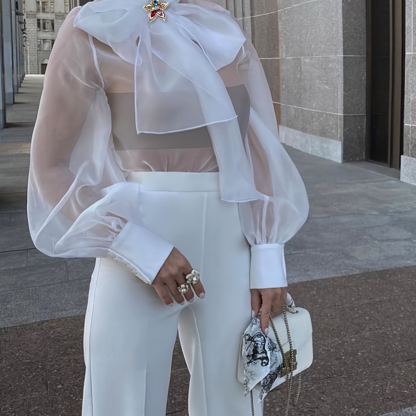 Elegant Plus Size Women'S Blouse with Sexy Bow Collar, Bubble Sleeves, and Pearl Accents - Chic Solid Color Non-Stretch Fabric for All Seasons, Plus Size Blouses