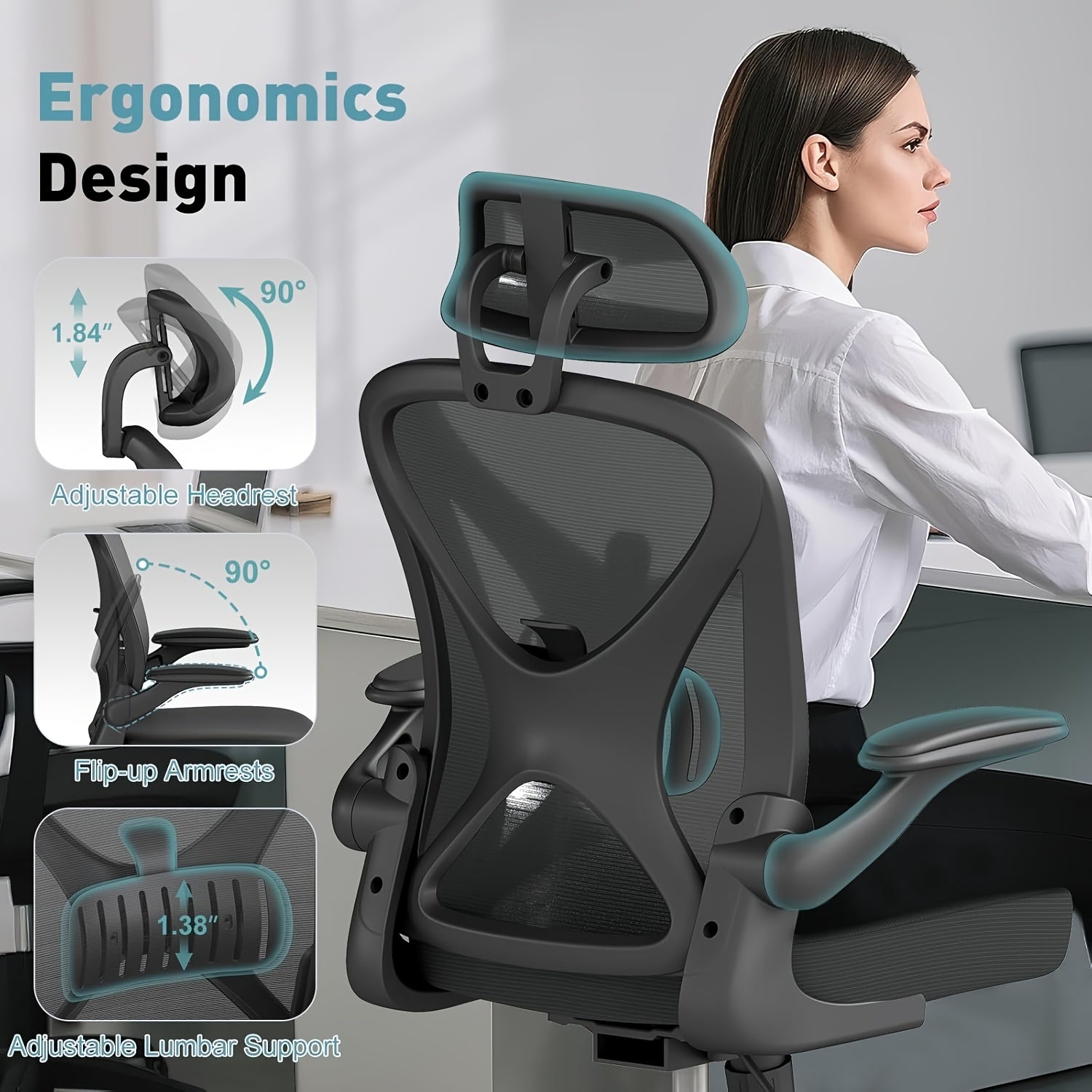 Ergonomic Office Chair with Adjustable Headrest & Lumbar Support, Height-Adjustable Computer Desk Chair with Flip-Up Armrests, 360° Swivel, Breathable Mesh Backrest & Seat, Durable Plastic Frame - Black for Home & Office Use