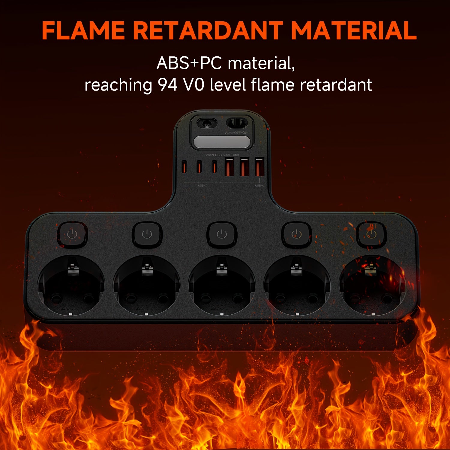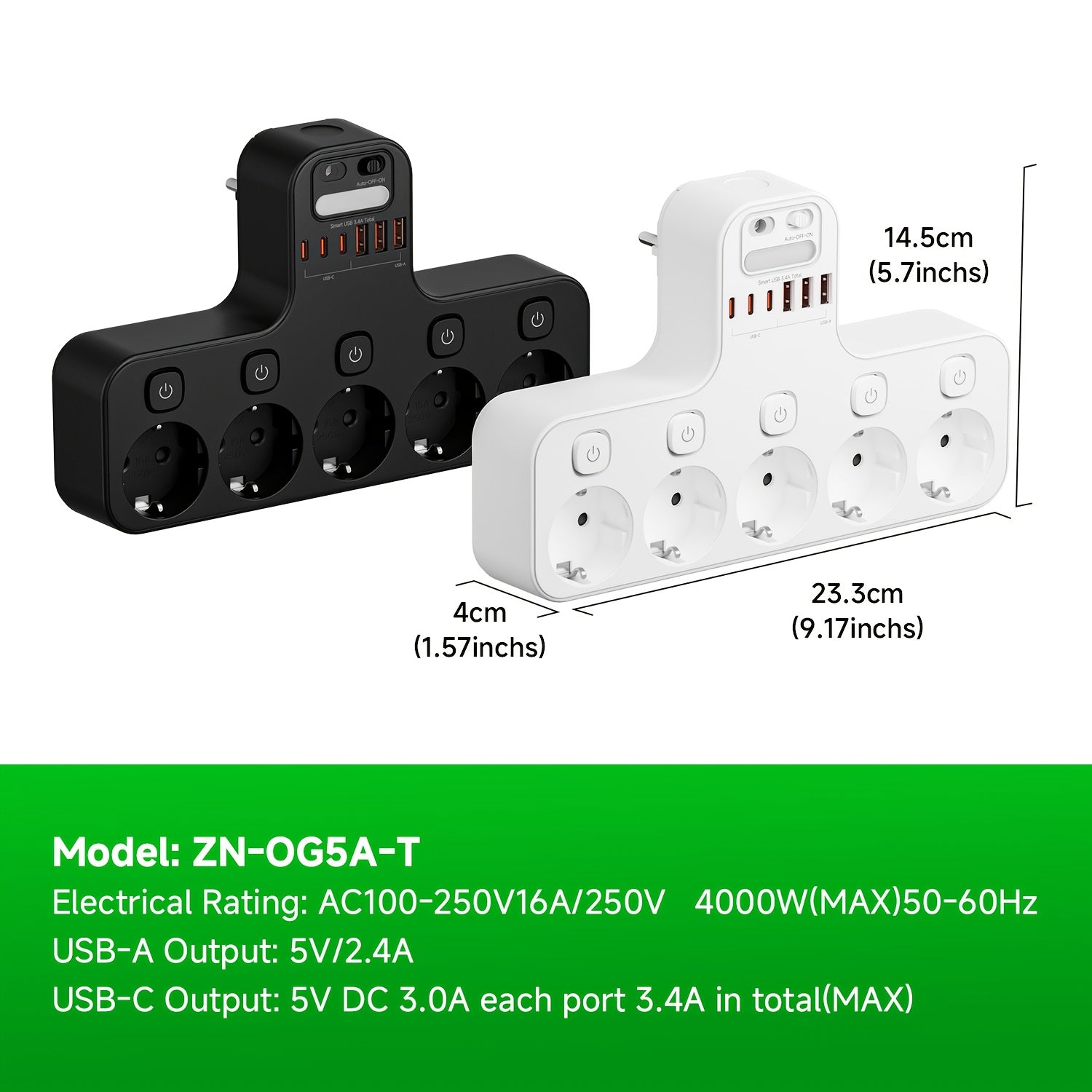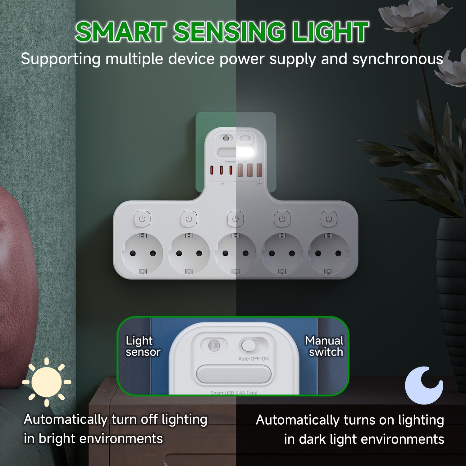 European Wall Power Strip with 5 AC Outlets & 3 USB-A/3 USB-C Ports, Smart Power Strip with Individual Switches, Overload Protection, 3 Lighting Modes & Auto On/Off Timer, EU Plug (220V) for Home, Office, Dorm - Space-Saving