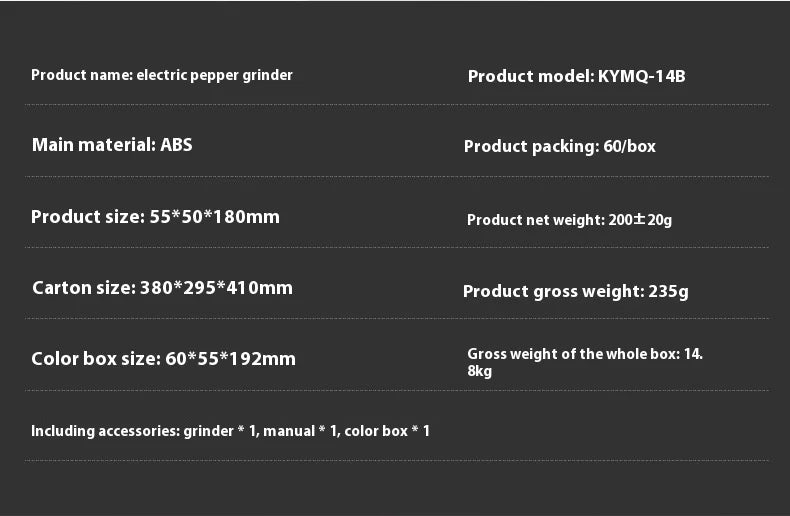 SKU:191288010:-1#Led light electric pepper grinder(color box packing);210190051:190093415#70 ml