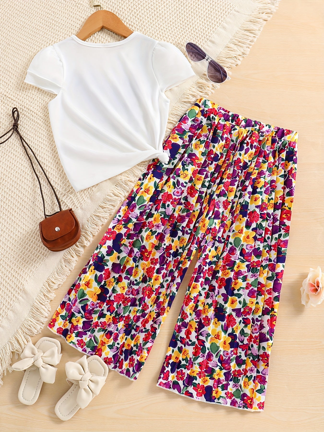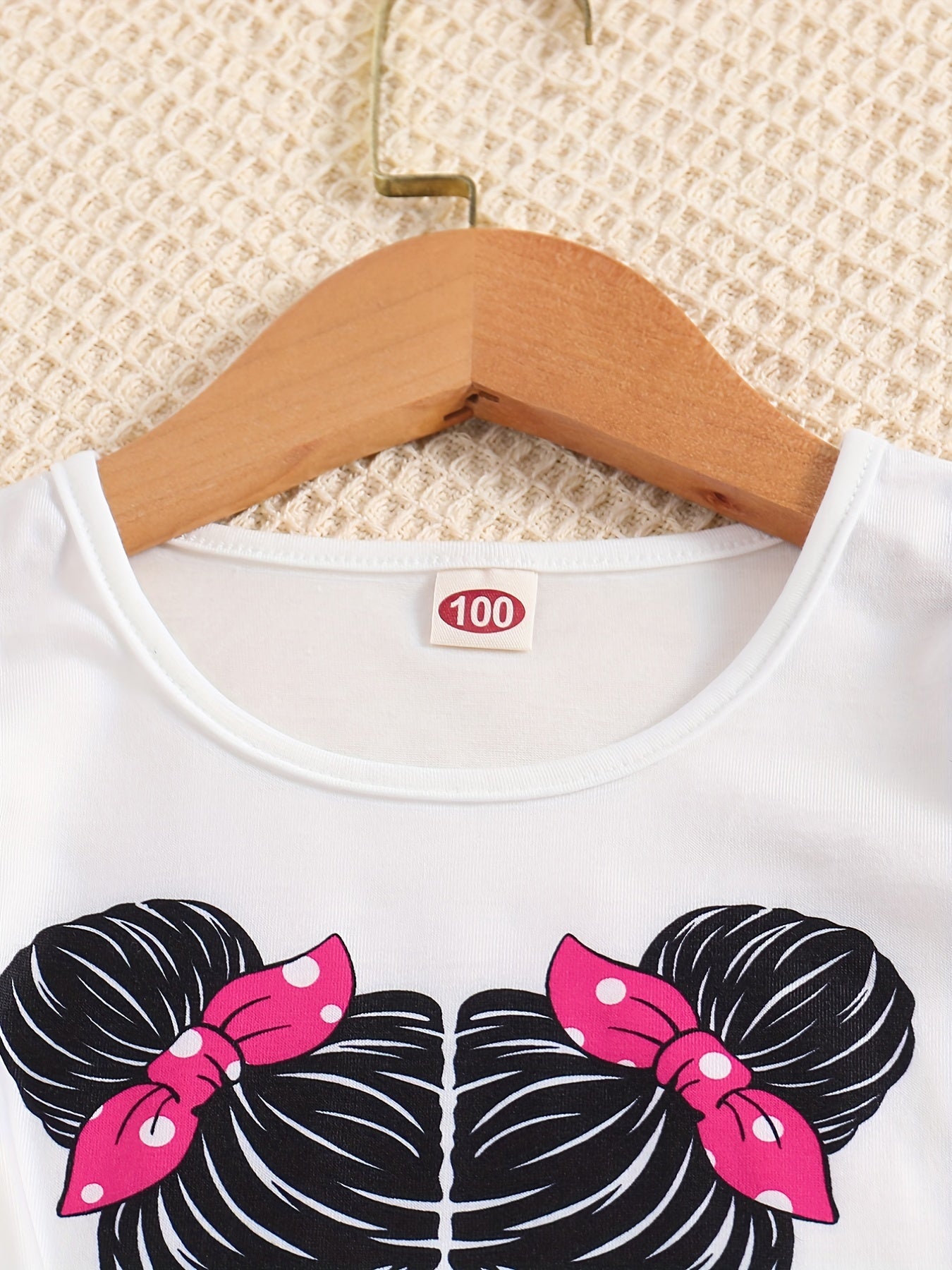 Girls' Fashion 2pcs Set, Cartoon Print Crew Neck T-Shirt & Pleated Polka Dot Pants, Casual Summer Outfit, Polyester & Spandex, Knit Fabric, Regular Fit - HWMFSNHFZ, for Outdoor