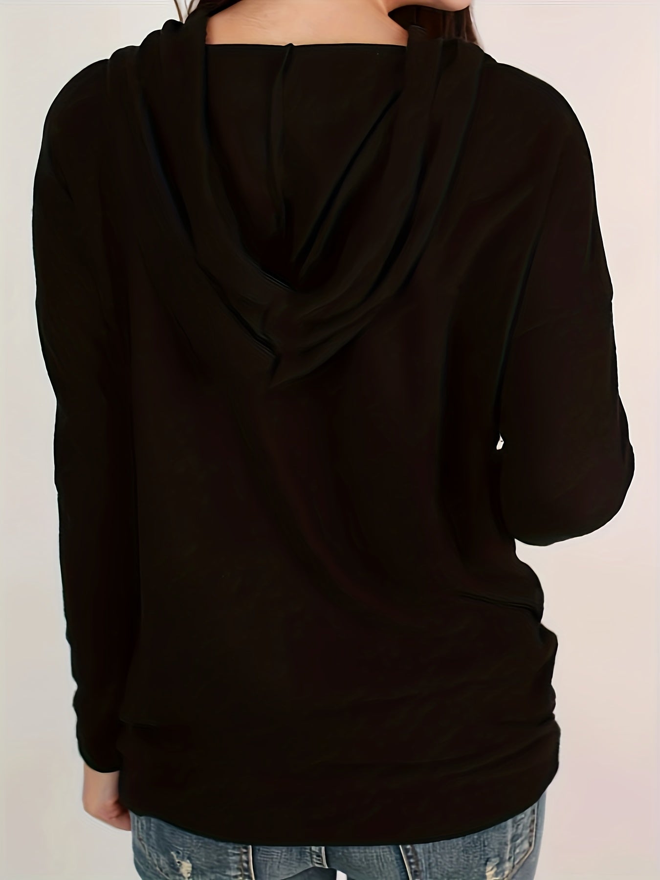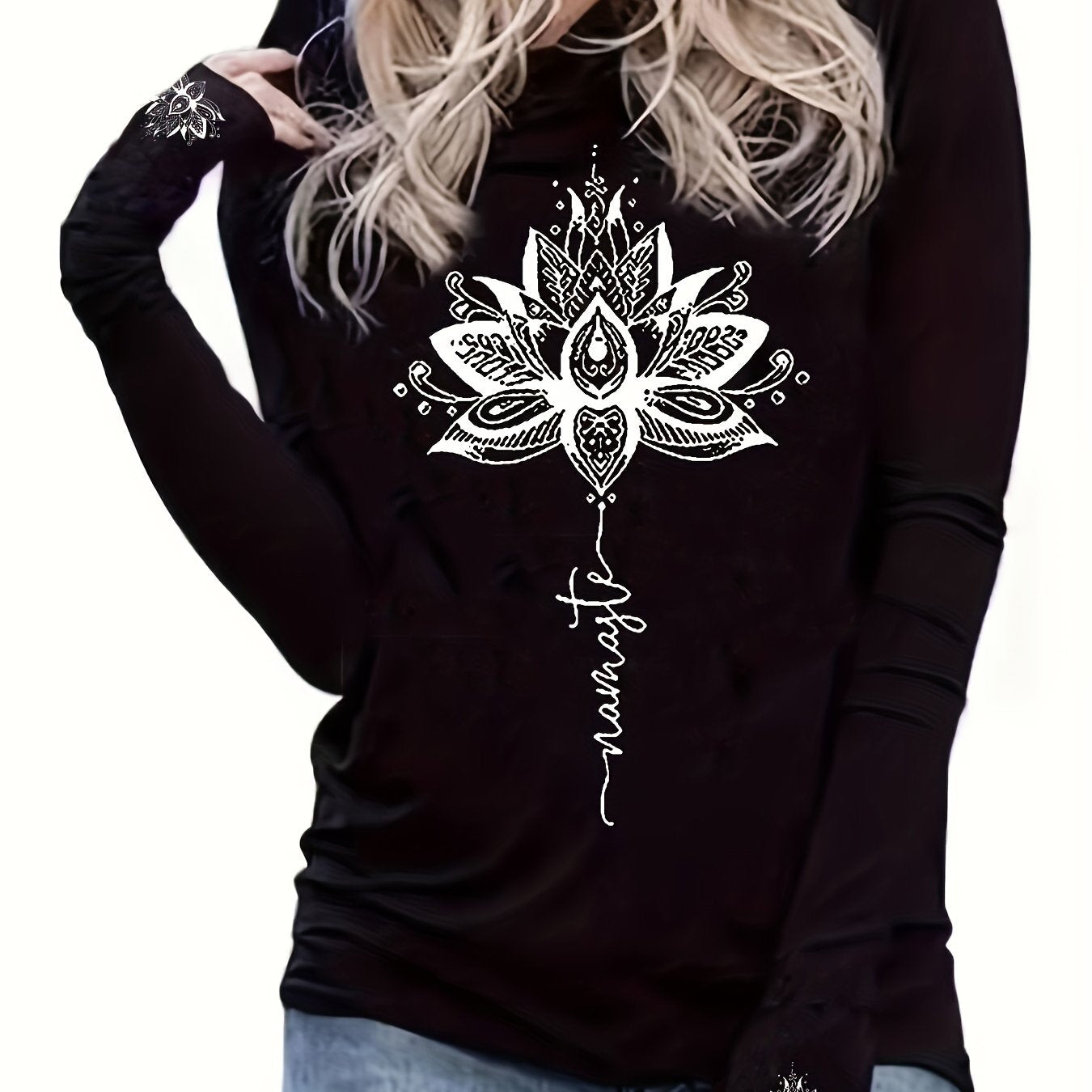 Lotus Print Crew Neck Hooded T-shirt, Casual Long Sleeve T-shirt For Spring & Fall, Women's Clothing