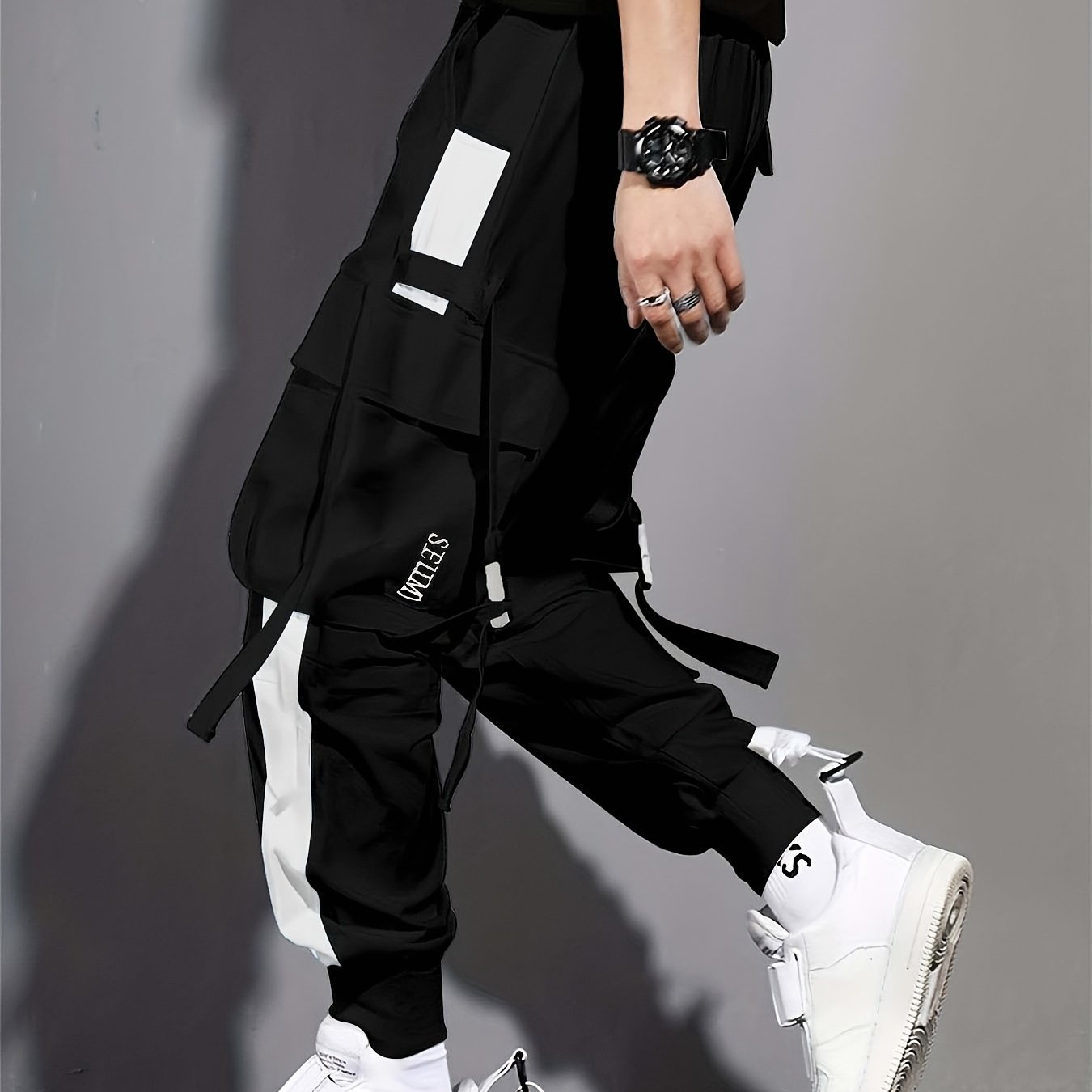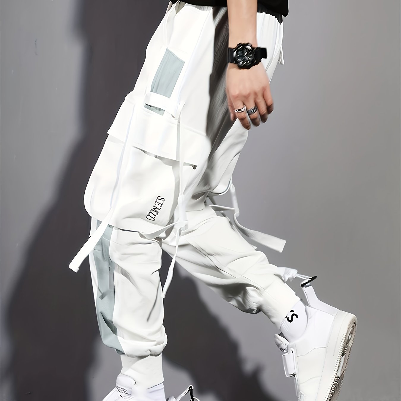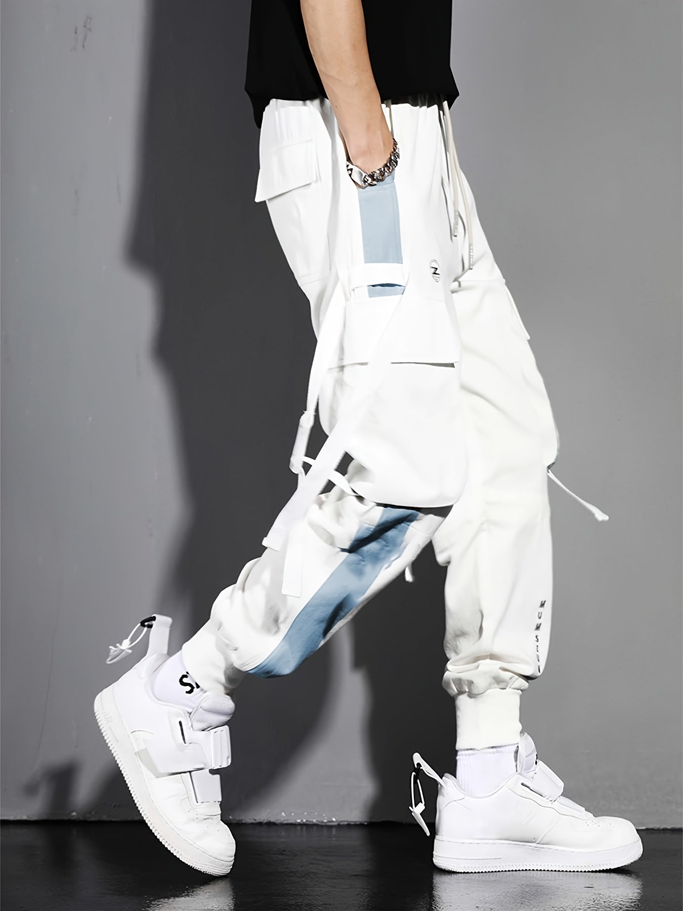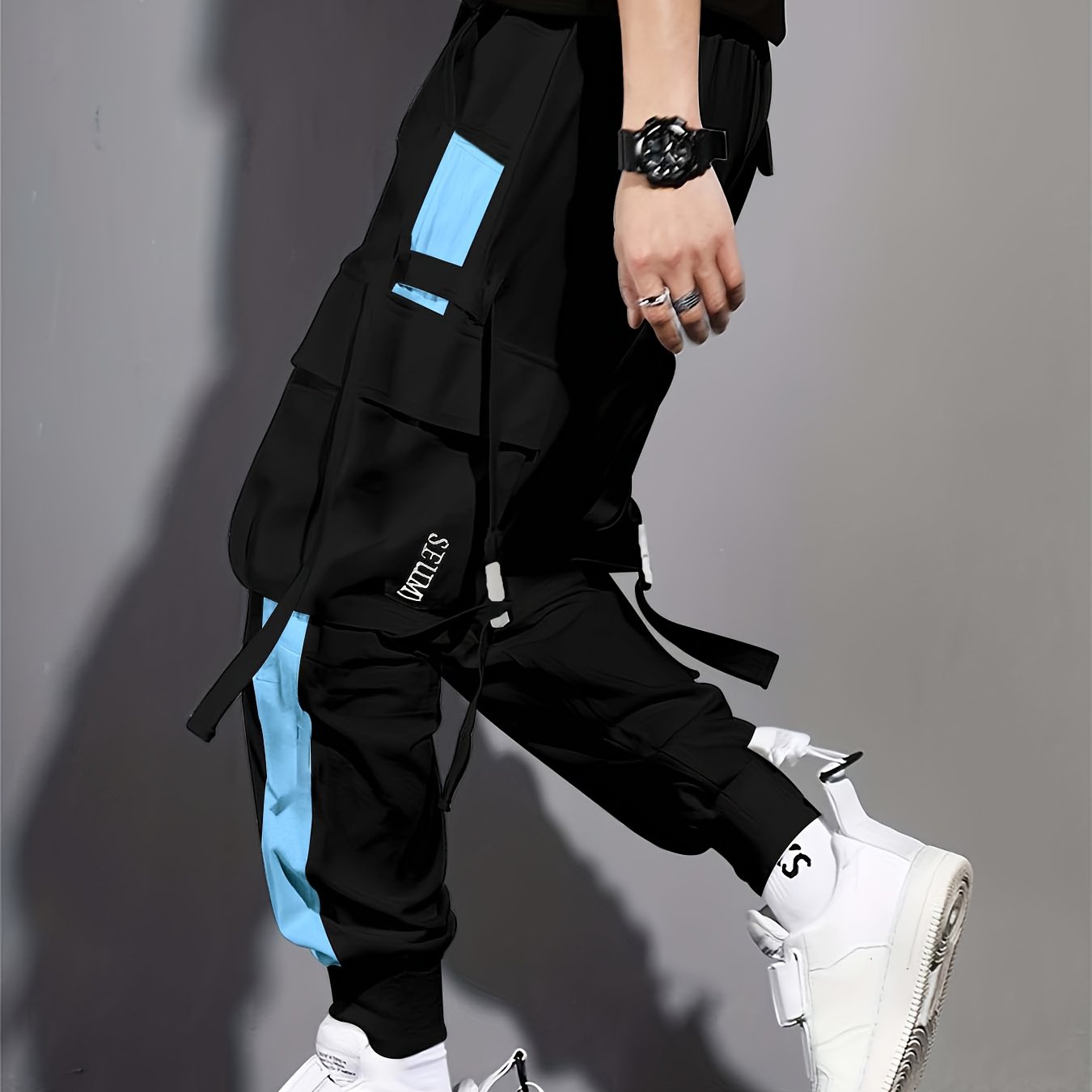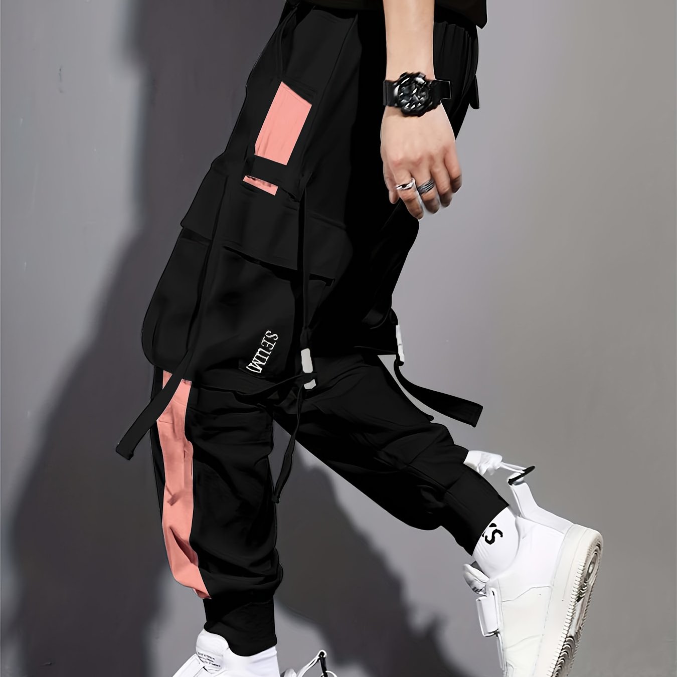 Multi-pocket Ribbon Design, Men's Color Block Cargo, Trendy Comfy Jogger Pants