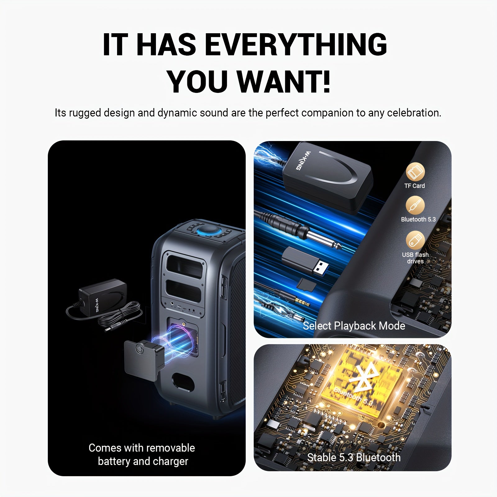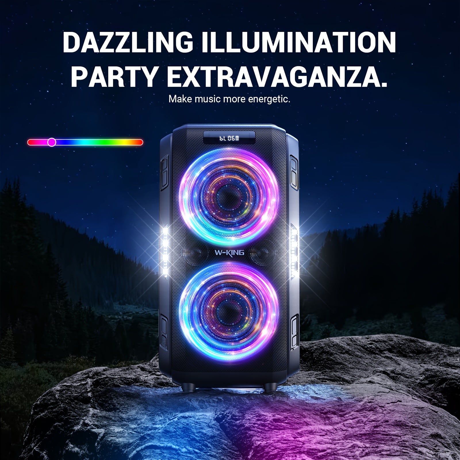 Powerful W-KING 200W peak wireless speaker with massive 120dB soundstage and DSP chip, 12-level bass adjustment, Big Party Boombox portable speaker with super deep bass, dynamic light show, 6.35mm microphone input, TF card sl