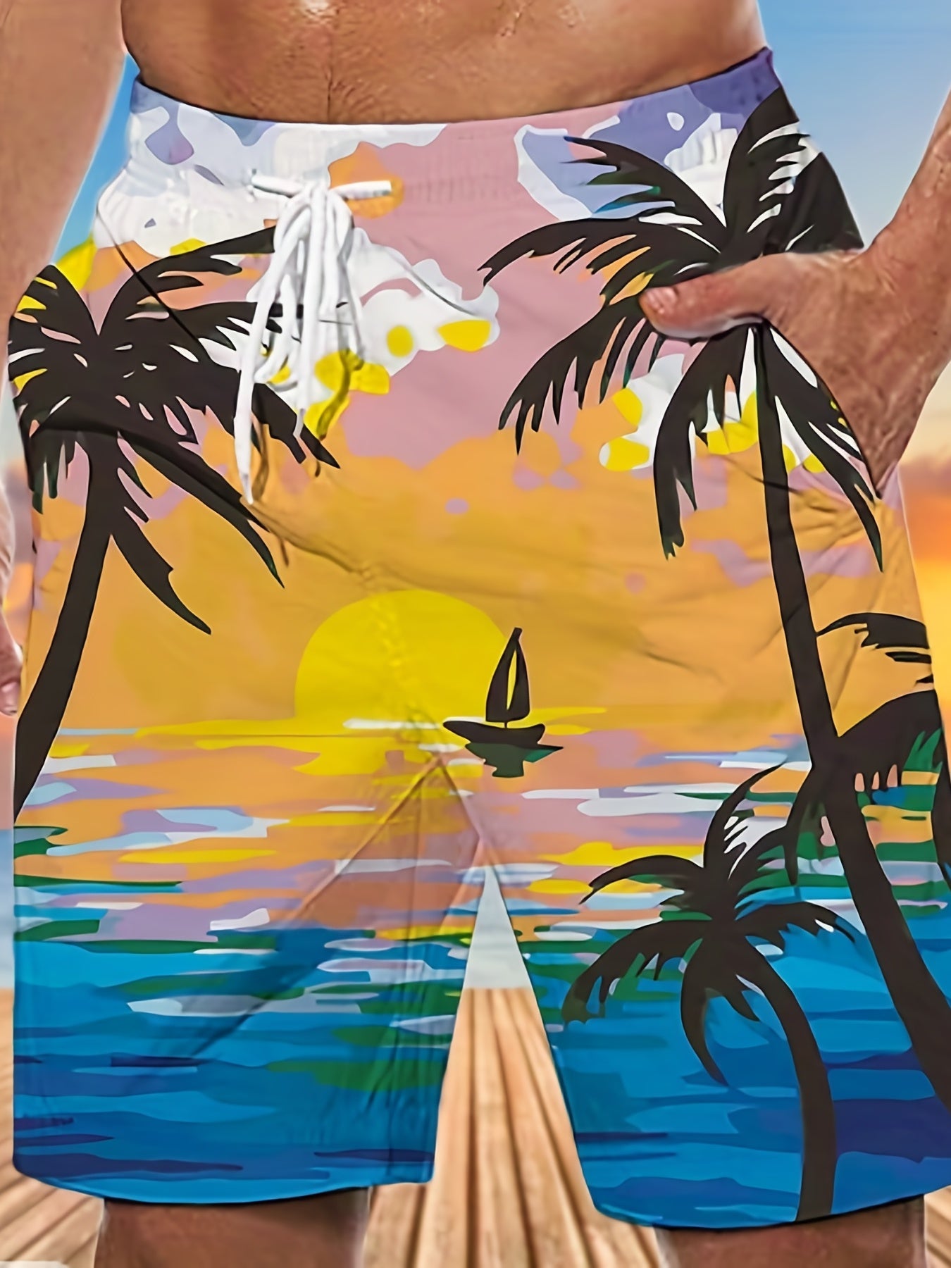 Quick Drying Comfortable Breathable Gradient Palm Tree At Dawn Seaside Drawstring Swim Trunks, Men's Board Shorts Swimwear For Summer Vacation Resort Beach Pool