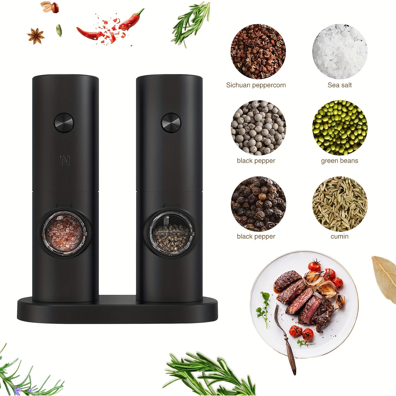 Single or Double Pack Options, Includes Base for Two-Pack - Electric Salt and Pepper Grinder with One Hand Operation, Battery Powered, Adjustable Coarseness, LED Light & Stand, Suitable for Kitchens, Food Seasoning Device, Di