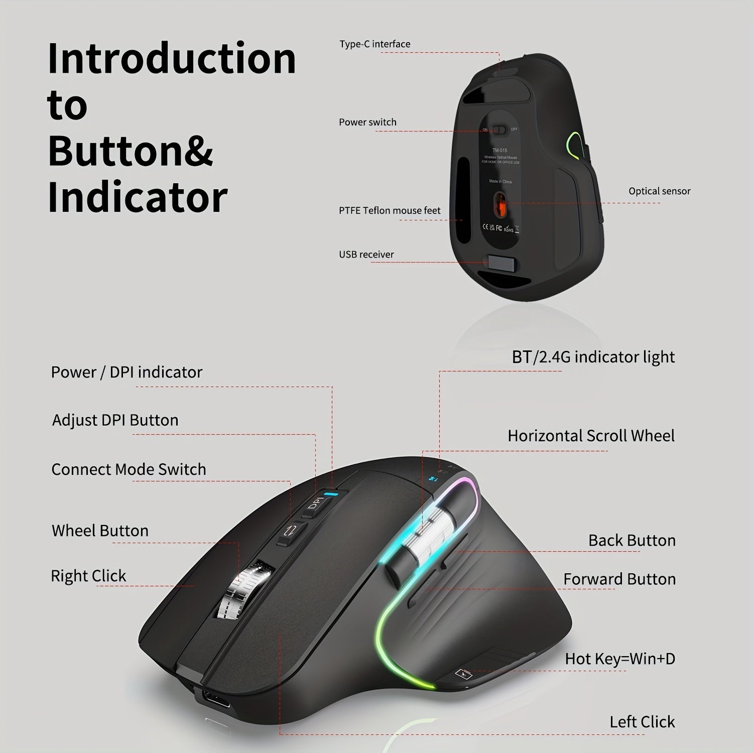 Wireless Wireless Mouse, 2.4GHz, Type-C Wired Three Mode Connection, Artificial Vertical Mouse, Rechargeable Optical Mouse, RGB Office Gaming Mouse, Four-Speed Adjustable DP; with 8 Buttons, Dual Sliders Right-Handed Mouse, M