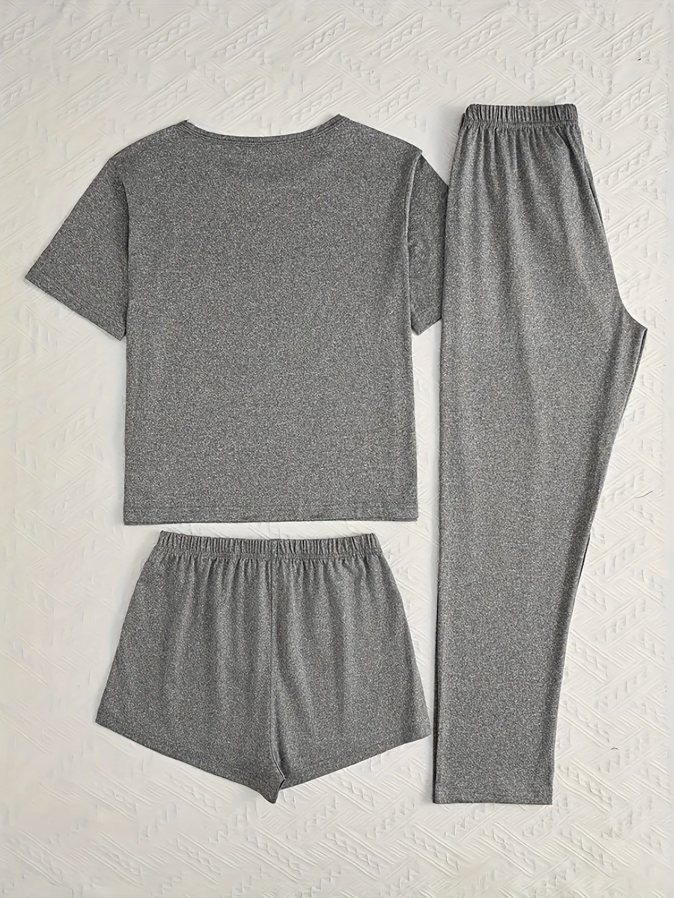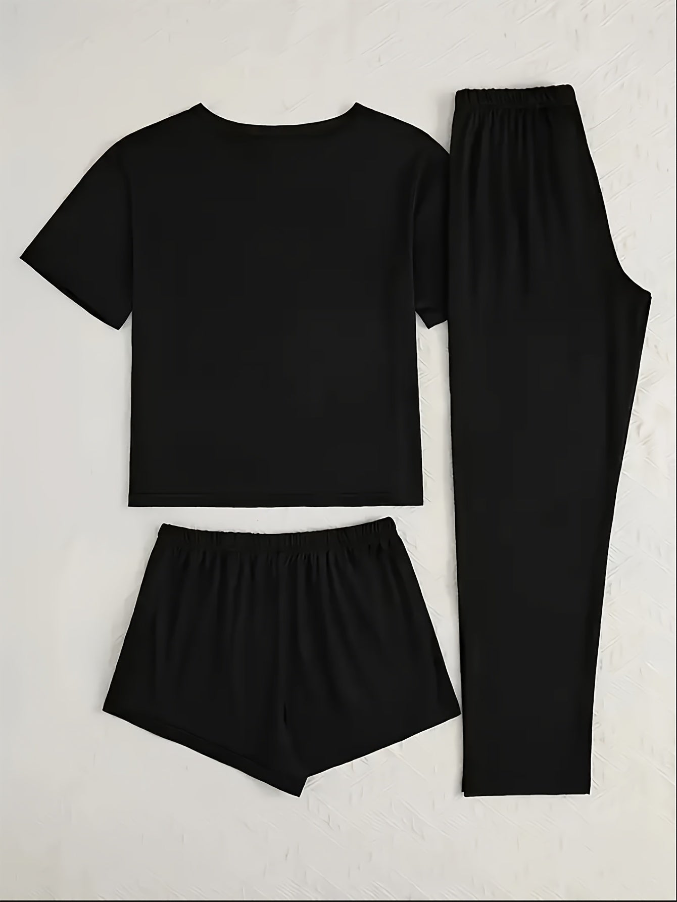 Women's 3pcs Pajama Set, Cartoon Work Kitten Print Short Sleeve Pajamas, Shorts and Longs - Bow Style, Suitable for Multiple Seasons