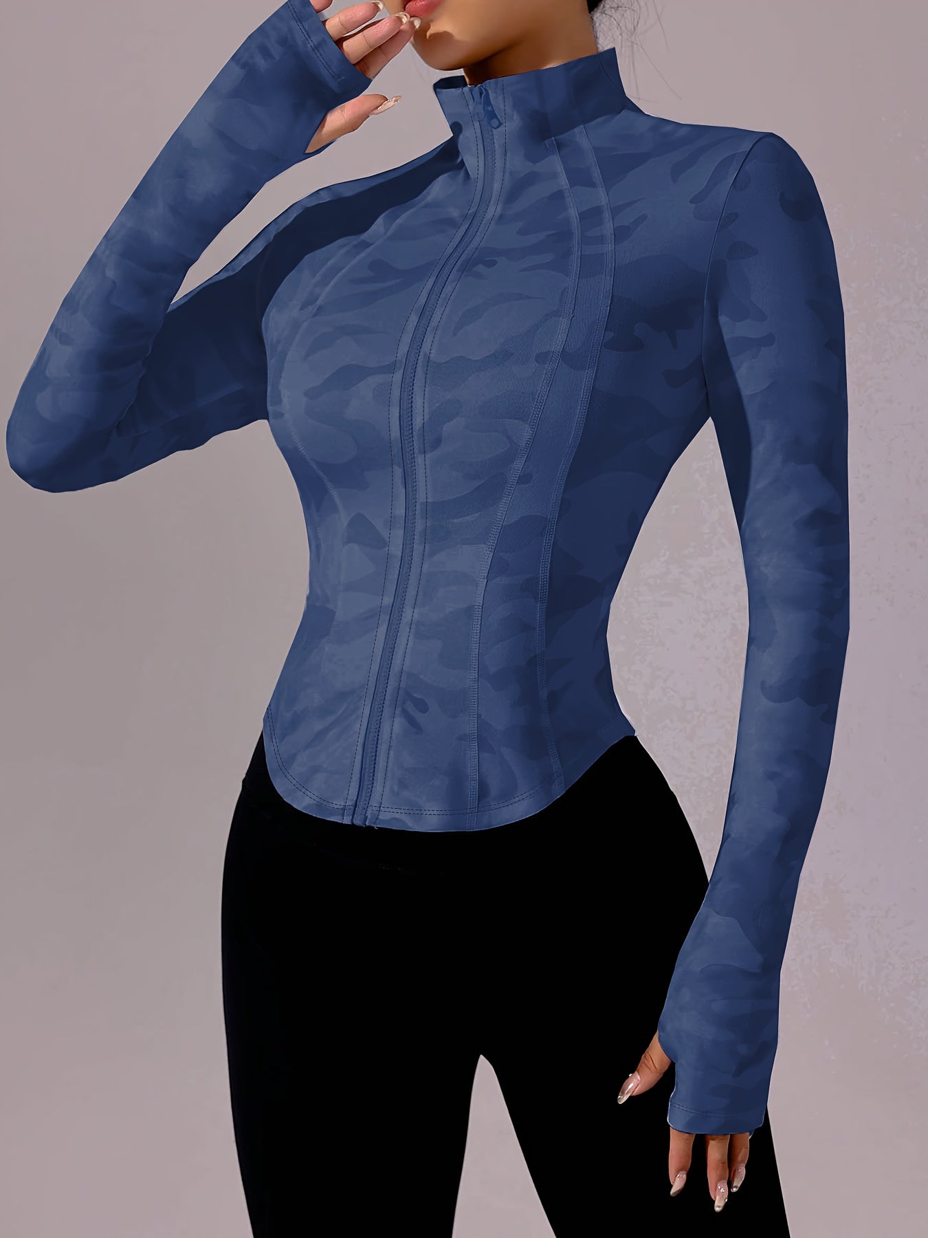 Zip-Up Stand Collar Sports Jacket, Half-Finger Long Sleeve Top with camouflage print, suitable for outdoor fitness, hiking, golf, tennis, badminton, bowling, daily walks and shopping, gym/home training, meditation, versatile.
