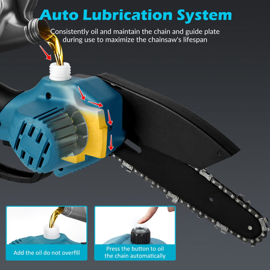 Mini motosserra sem fios Jemi Tool de 15,24 cm com bateria de 1/2×21 V, potente motosserra elétrica portátil com lubrificação automática, leve (1,0 kg), fácil de utilizar para podar, cortar e aparar.