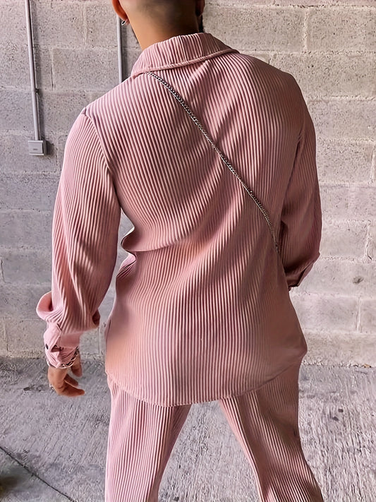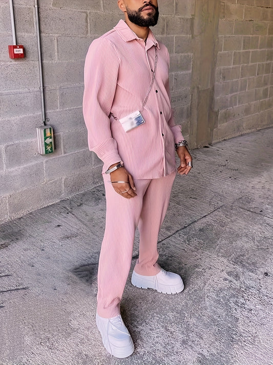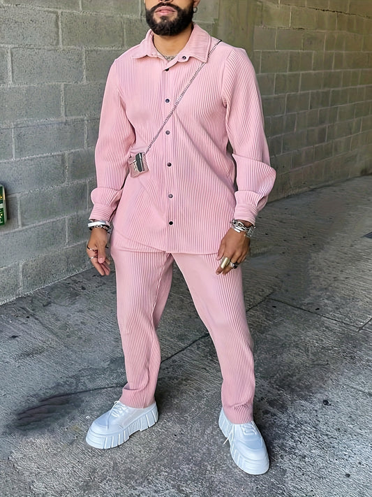 Conjunto de homem de 2 peças, camisa de manga comprida com lapela e botões, e calças de fato para o verão. Ideal para o lazer diário e férias em resorts. Estilo Coquette.