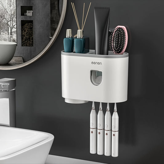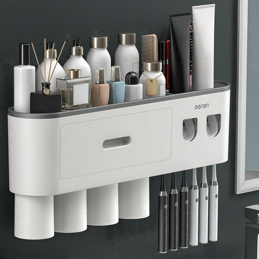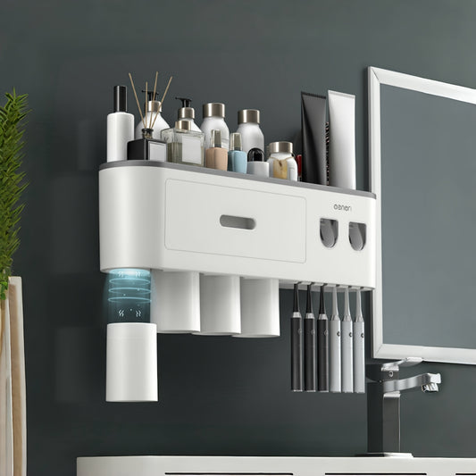 No Drill Adhesive Wall-Mounted Modern White Bathroom Organizer Set with 2-in-1 Magnetic Toothpaste Dispenser & Multi-Tier Storage Shelf - Space-Saving Over Sink Organizer with Suction Cup Hooks, Durable Plastic Construction f