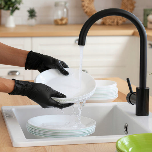 Luvas de nitrilo pretas, sem pó, tamanho M, embalagem com 100 unidades. Fabricadas em nitrilo de alta qualidade, resistentes a perfurações, produtos químicos e rasgões. Sem látex e sem pó, hipoalergénicas e seguras para peles sensíveis. Tamanho único.