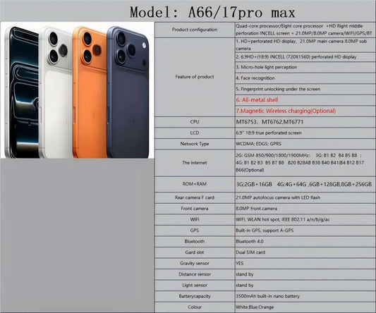 Smartphone Promax A66/17 5G Dual SIM com 16GB+1TB, CPU Deca Core, Câmara Traseira de 108MP, Idiomas Operacionais: Espanhol, Francês e Inglês.