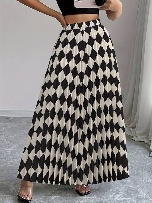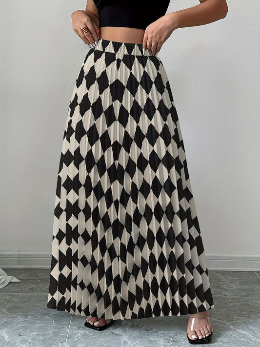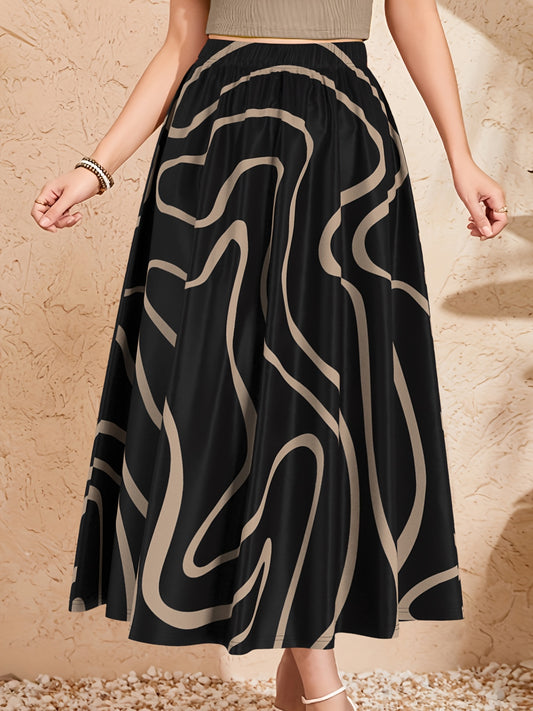 Saia midi elegante para mulher com cós elástico - Saia evasé com estampado geométrico preto e bege, tecido 120g para uso casual, no trabalho e em viagem - Lavável à máquina, ajuste confortável