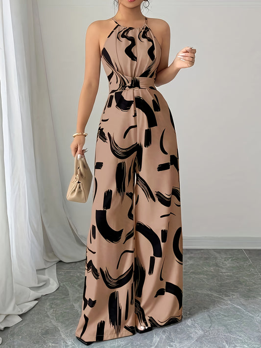 Women's Elegant High-Waisted Sleeveless Wide-Leg Jumpsuit - Beige Stand Collar Non-Stretch Machine Washable All-Season Versatile Outfit for Casual & Formal Events (NS702), Event Clothing | Sophisticated Style | Sophisticated