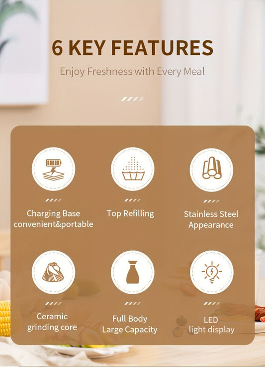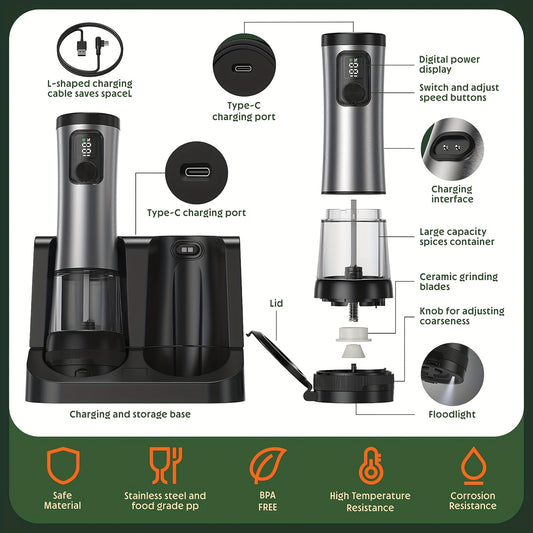 1pc/2pcs Option, Rechargeable Electric Salt And Pepper Grinder, Automatic Salt And Pepper Grinder with LED Light, Adjustable Coarseness, Large Capacity, Suitable for Home Kitchen Barbecue, Restaurant, Outdoor, Wedding Gift