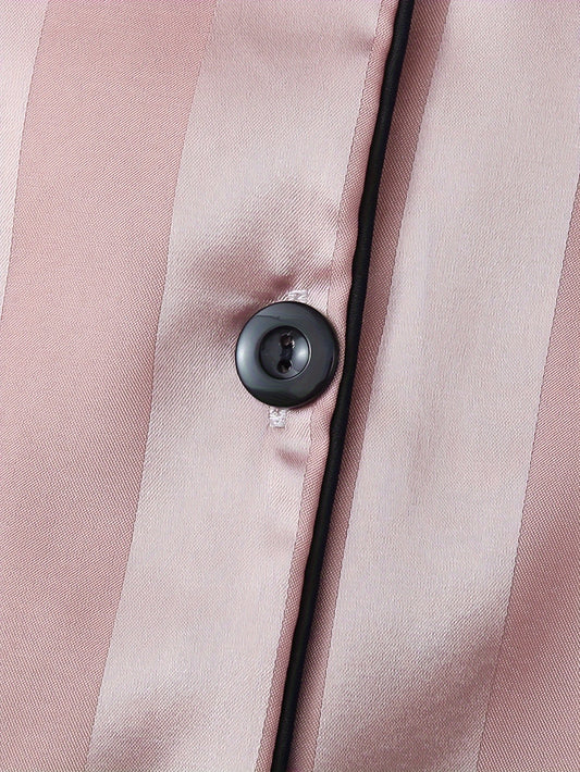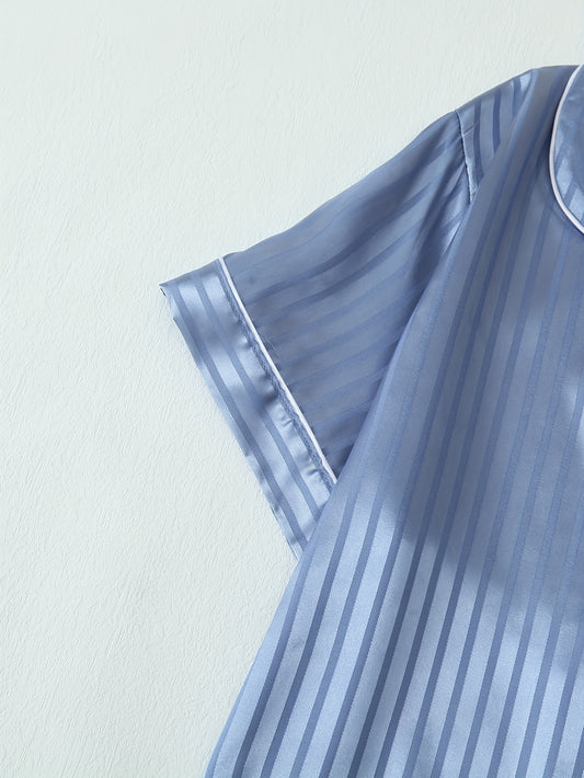 2 Sets Women's Striped Satin Casual Pajama Set, Short Sleeve Buttons Lapel Top & Shorts, Comfortable Relaxed Fit