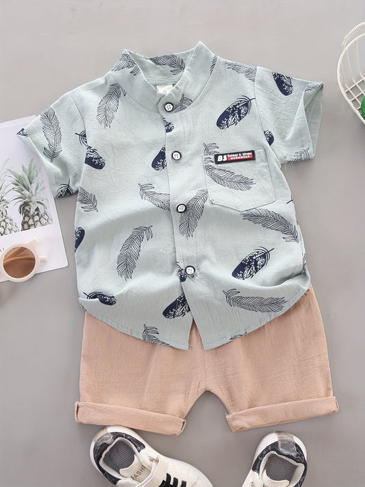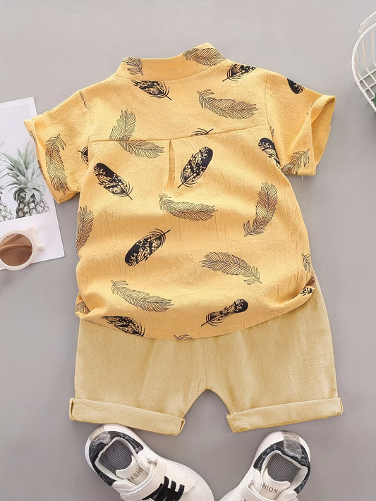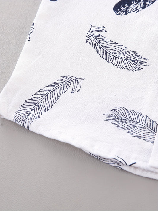 Conjunto casual para bebé menino - Camisola de manga curta e calções com estampado de penas - Conjunto infantil de 2 peças para atividades ao ar livre