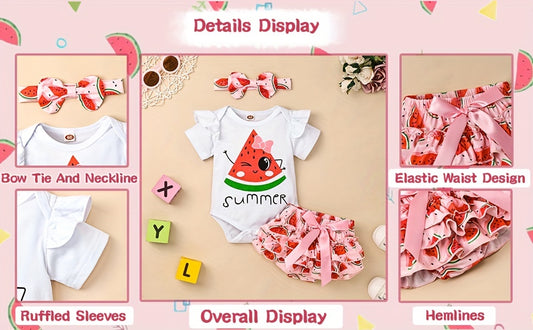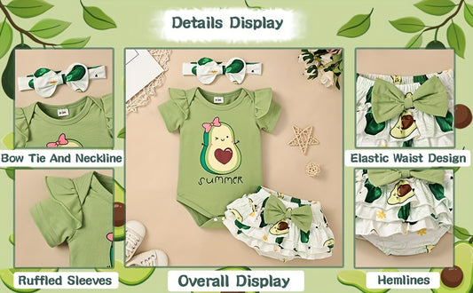 Conjunto de Roupa Infantil para Bebé Menina com Estampado de Abacate: Macacão, Calções e Fita para o Cabelo - 3 Peças - Ideal para o Verão e Atividades ao Ar Livre