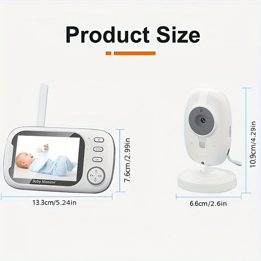 Babyphone com ecrã LCD de 8,89 cm e resolução 720p, alcance de transmissão sem fios de 274,32 metros, visão noturna automática, chamadas de áudio bidirecionais, sensor de temperatura, 8 canções de embalar e editor integrado. Design compacto e portátil.