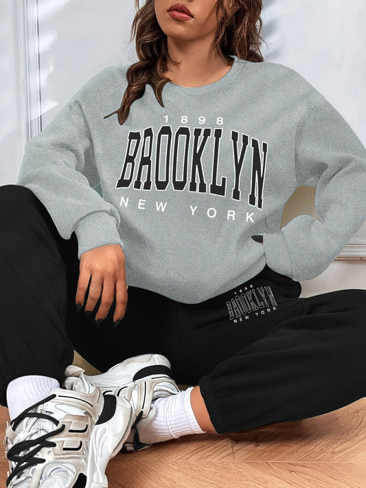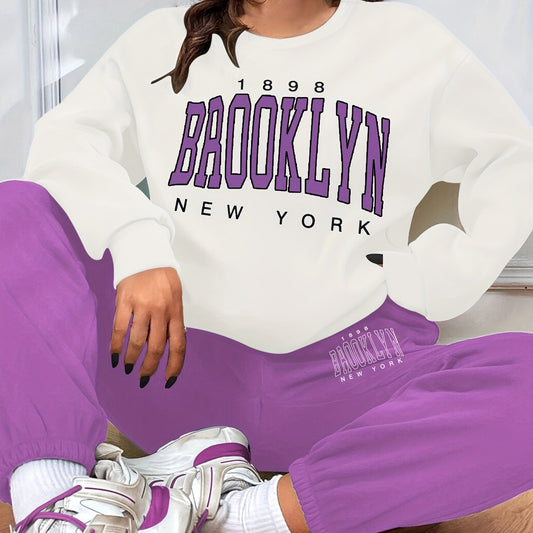 Conjunto casual de duas peças com blocos de cor, composto por uma sweatshirt com estampado de letras e calças jogger desportivas. Roupas femininas.