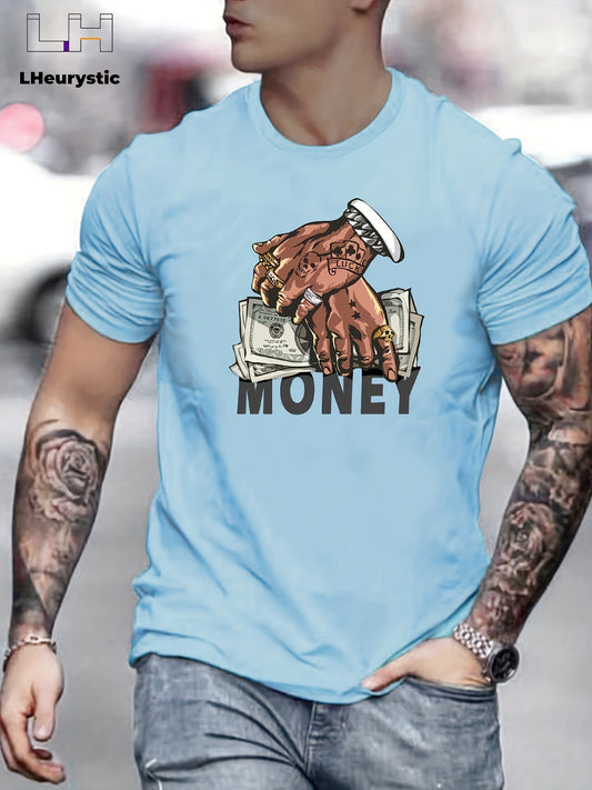 T-shirt de gola redonda para homem com estampado de dinheiro e mãos em estilo cartoon, t-shirt casual e confortável para o verão, ideal para usar no dia a dia em resorts e férias.