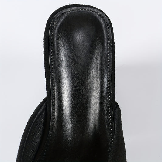 Chinelo feminino chique para o verão - Mules pretos de salto grosso e bico aberto, chinelos femininos de malha com salto alto e bico quadrado, com sola de borracha confortável.