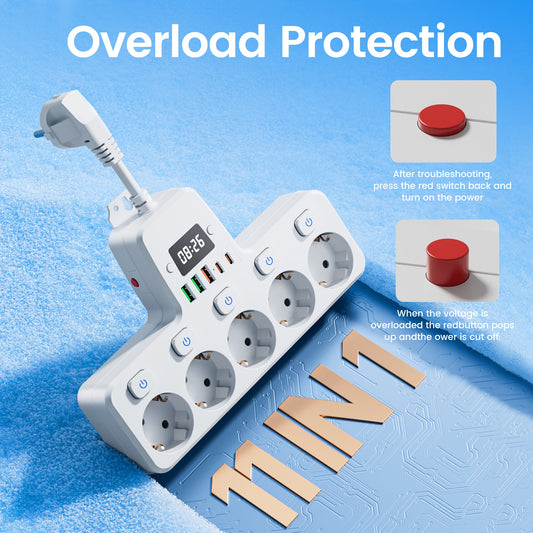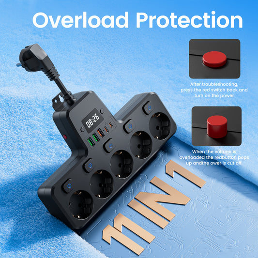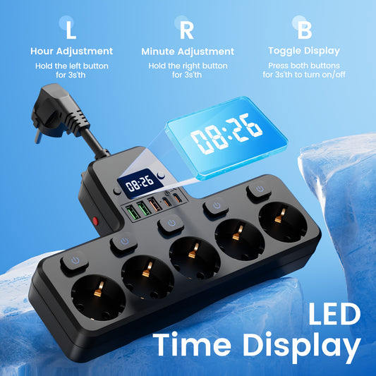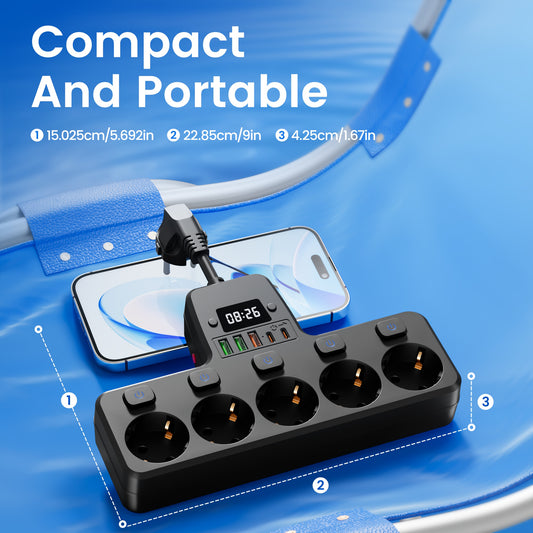 11-in-1 Heavy-Duty Power Strip with Clock, 5 AC Outlets & 3 USB-A/2 USB-C Ports, EU Plug (220-240V), Independent Switches, Surge -like, Wall-Mountable Extension Cord for Home, Office, Hotel - Global Voltage Compatible