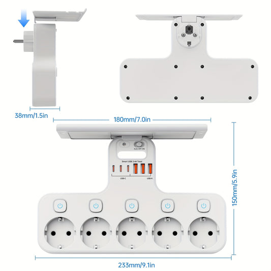 11-in-1 5 Independent Switch Power Socket EU Standard Plug Wall Socket 6 USB (3 Type-C) Solve Your Power Not Enough Trouble Independent Control Smart Sensor Night Light Can Install Mobile Phone Baffle Bracket