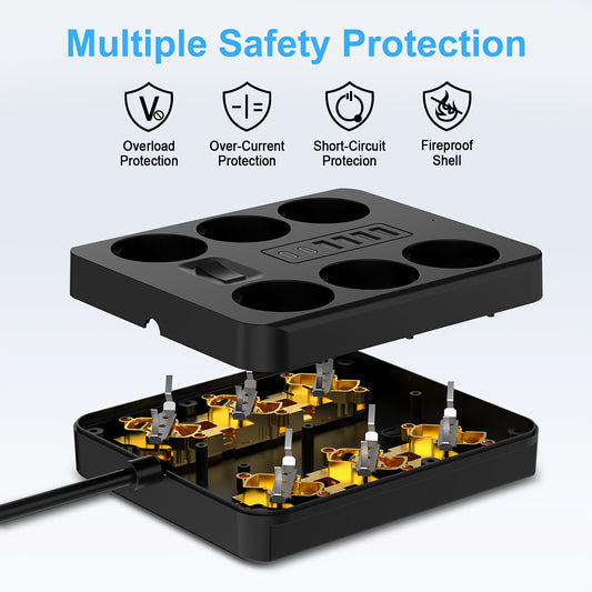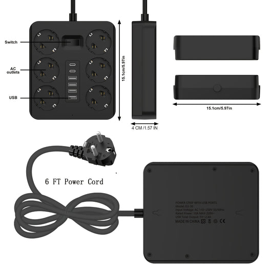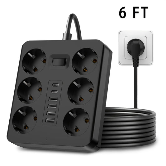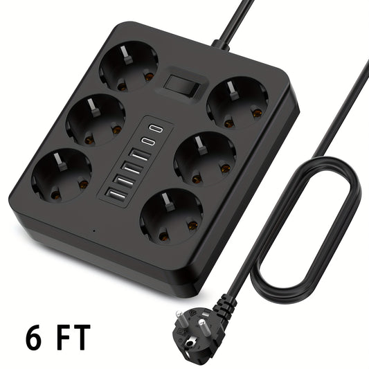 12-in-1 Power Strip with 6 Outlets and 6 USB Ports (2 USB-C) | 182.88cm Flat Plug Wall-Mounted Desktop Charging Station, Suitable for Home Office Dorm Essentials | Multi-Plug Expander