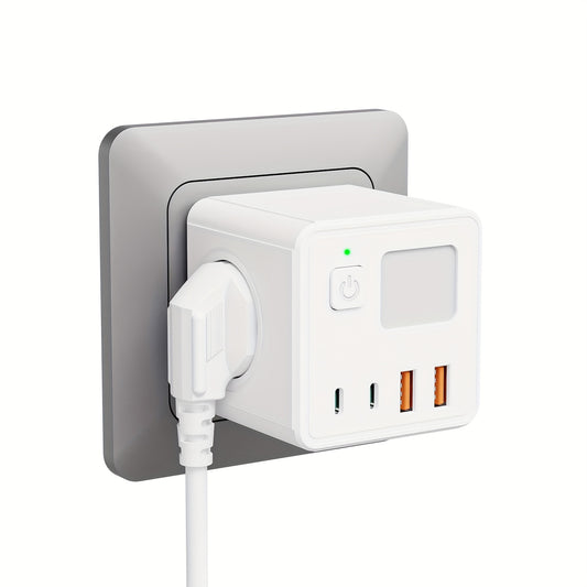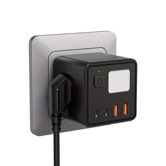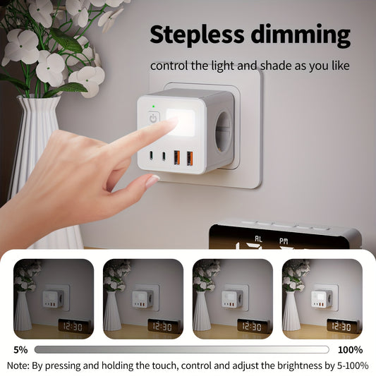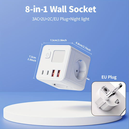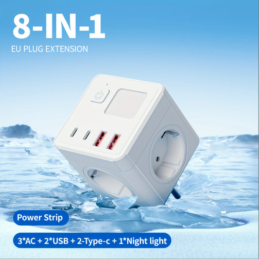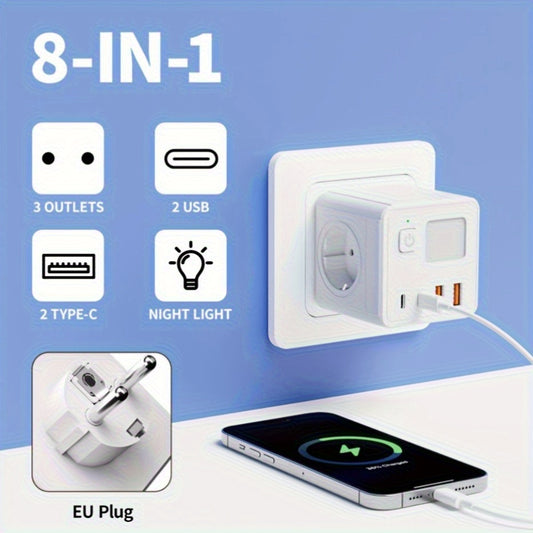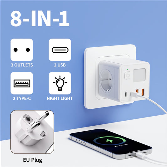 An 8-In-1 EU Power Strip with 3 Outlets, 2 USB Ports, 2 Type-C Ports, And a 3-Color Night Light. The Night Light Has Adjustable Brightness And Three Color Options, Suitable for Home, Office, Travel, And Computers, Available i