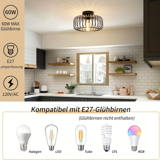 1pc Industrial 3 Way Ceiling Light, Hanging Light, Semi Flush Mount E14 Base, Black Metal Cage 3 Lights, Bedroom, Living Room, Dining Room, Hallway, Ceiling Light Fixture (Bulb Not Included)