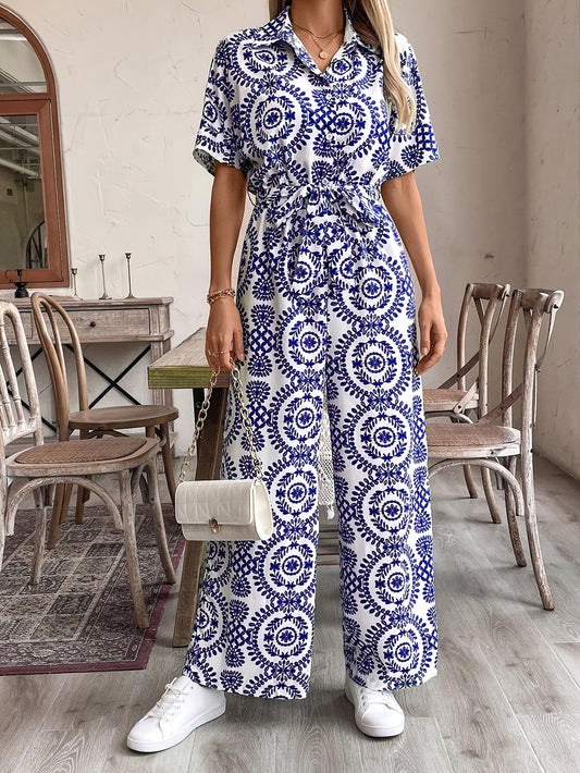 Women's Elegant Ethnic Floral Print Long Sleeve Jumpsuit - Navy Blue & White Retro-Inspired Button-Front Romper, Machine Washable Spring/Summer Dress for Casual & Formal Occasions, Floral Print Dress, Summer Outfit, Nontransp