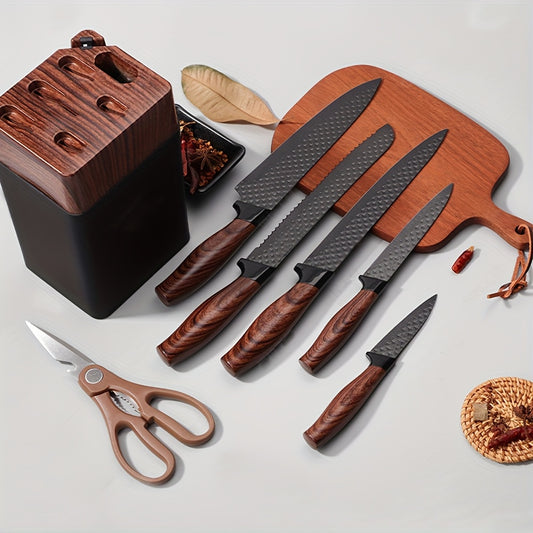 Conjunto de 7 facas de chef com bloco de facas em PE - Lâminas robustas em aço inoxidável 304, extra afiadas, pega ergonómica antiderrapante, facas de cozinha profissionais (chef, descascar, fatiar, pão, multiusos, tipo tesoura) - Kit de corte completo