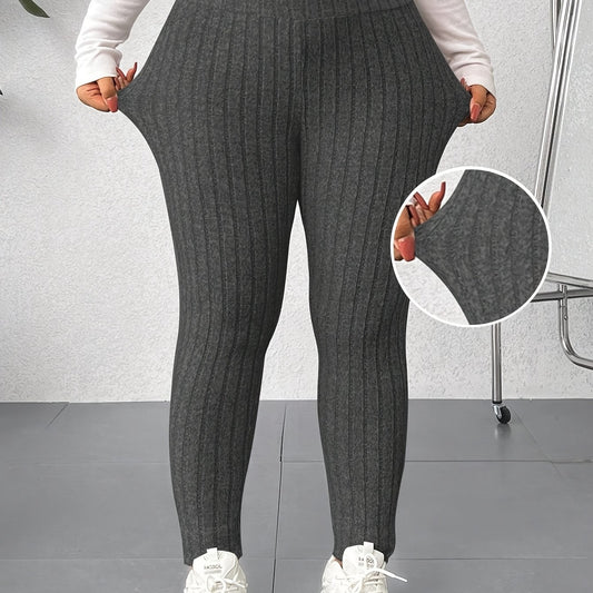 Women'S Plus Size High Waist Tummy Control Leggings with Side Pockets, 88% Polyester 12% Elastane, Knit Fabric, Stretchy Cropped Yoga Pants for Running & Fitness, All Season Solid Color Athletic Skinny Pants