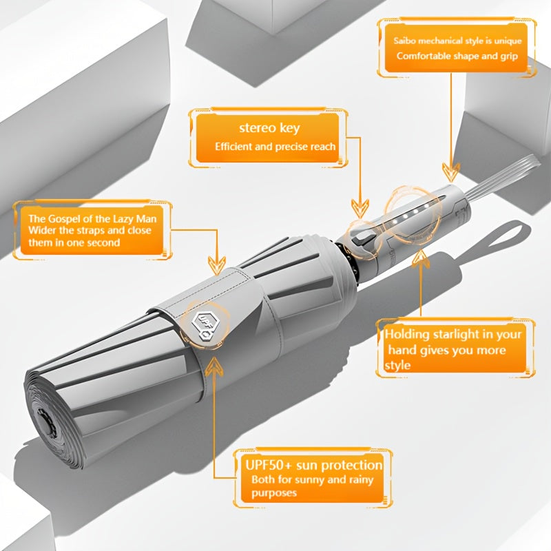 10 bone 3+3 glass fiber bone automatic folding umbrella, enlarged and thickened black rubber sunscreen coating, reinforced protective aluminum alloy skeleton, simple solid color design, unisex business sunshade dual-use umbre