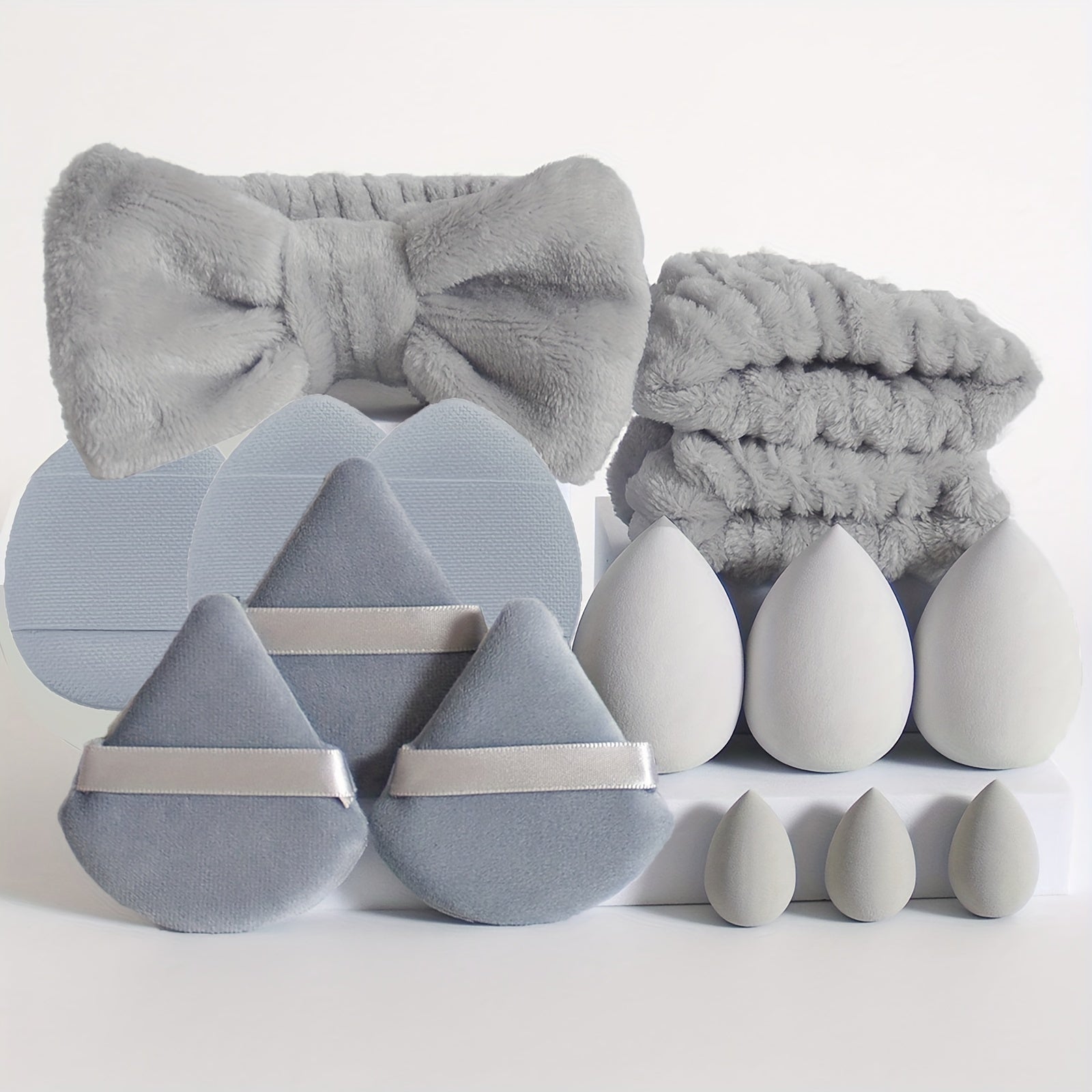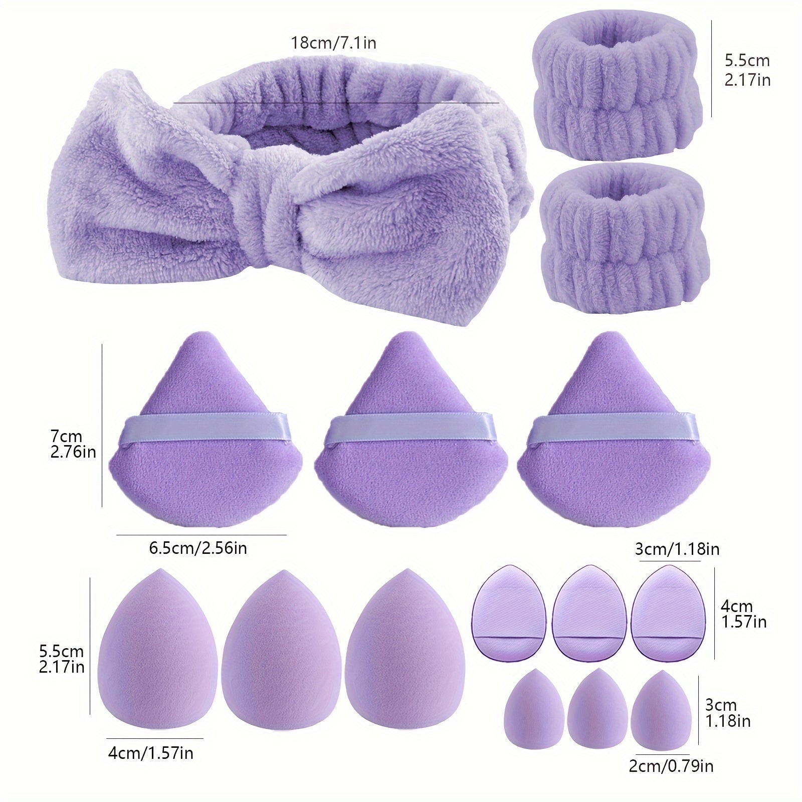 Conjunto de 15 peças de ferramentas de maquilhagem facial - 12 esponjas de maquilhagem ultramacias e laváveis para pó facial e corporal, ideais para base e cosméticos, além de 1 bandolete com laço e 2 pulseiras.