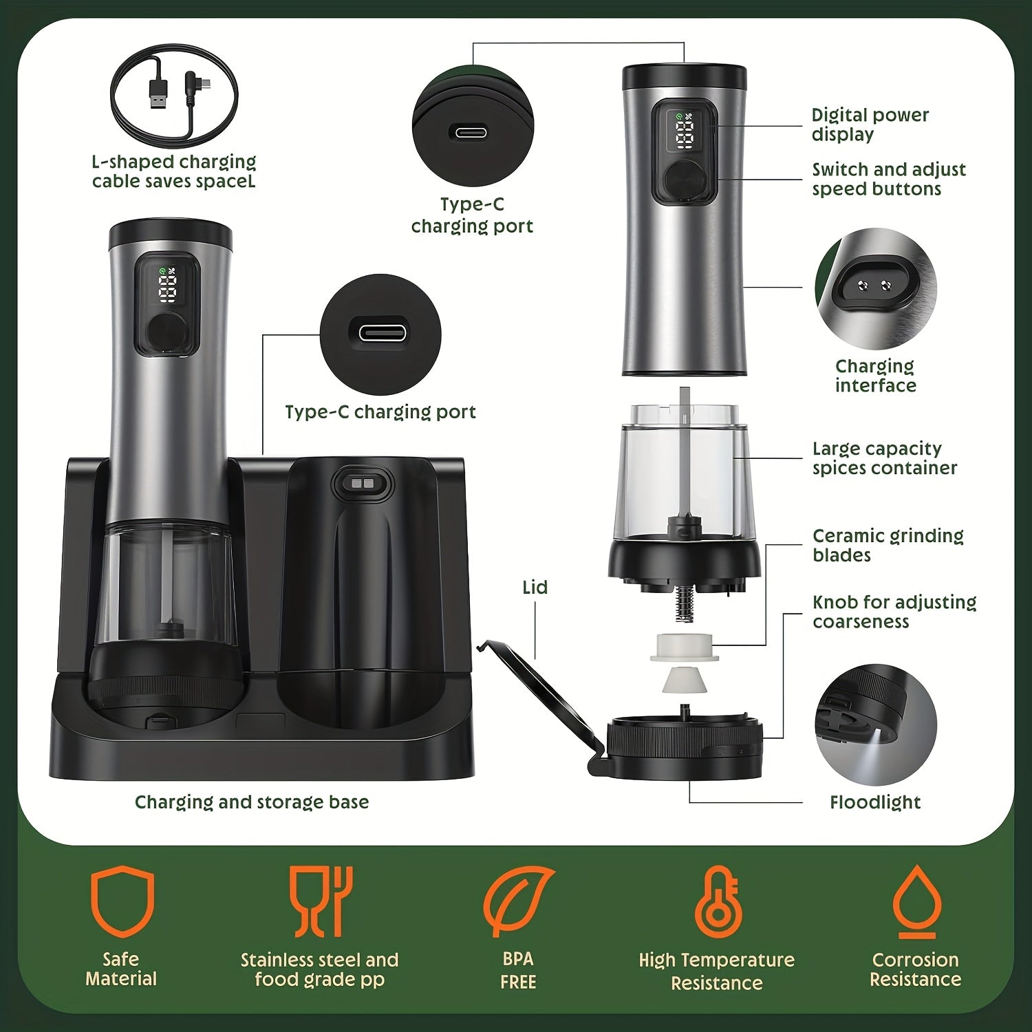 1pc/2pcs Upgraded Electric Pepper Grinder | Rechargeable Salt & Pepper Grinder - Variable Grinding Speed, External Coarseness Adjustment, Dust Cover & LED Light, Perfect for Restaurants, Kitchens, Picnics & Barbecues Christma