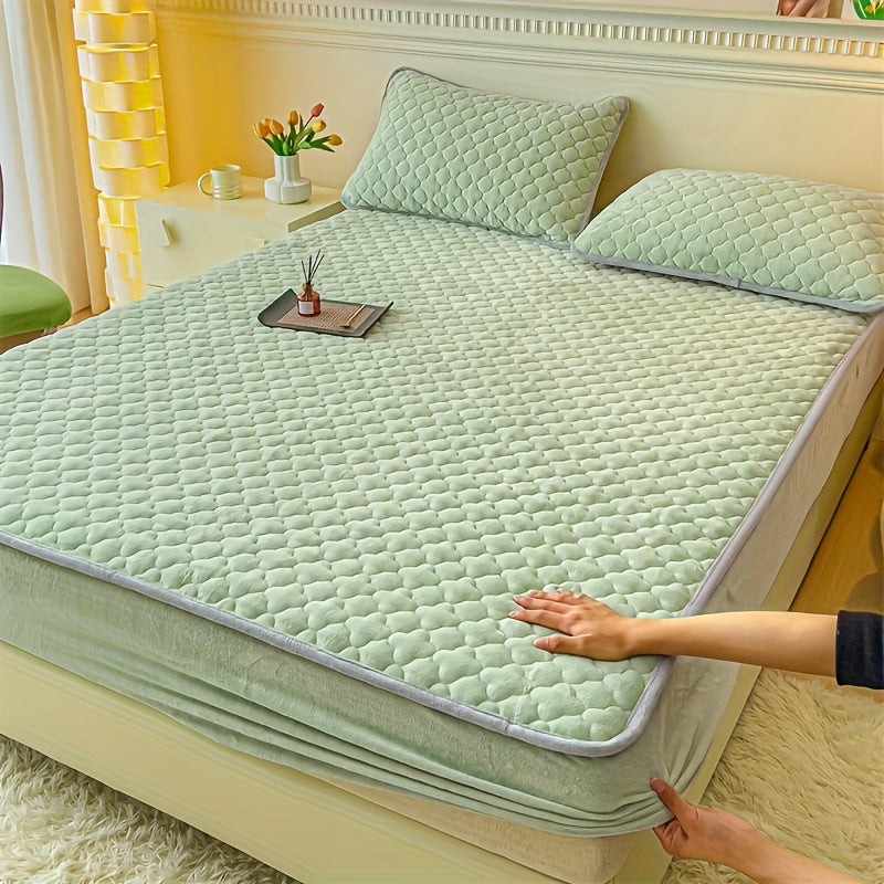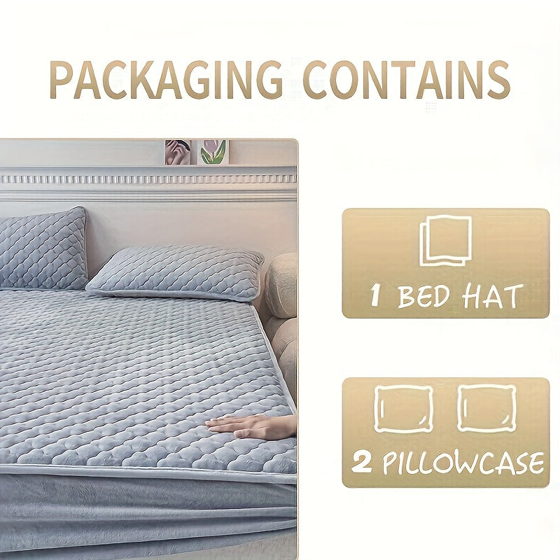 Conjunto de 3 peças de lençol de baixo e fronha em veludo macio e confortável, com enchimento grosso tipo sanduíche, excelente efeito de aquecimento, altura do lençol de baixo de 30 cm, estilo acolchoado, ideal para quarto de hóspedes e quarto de família.