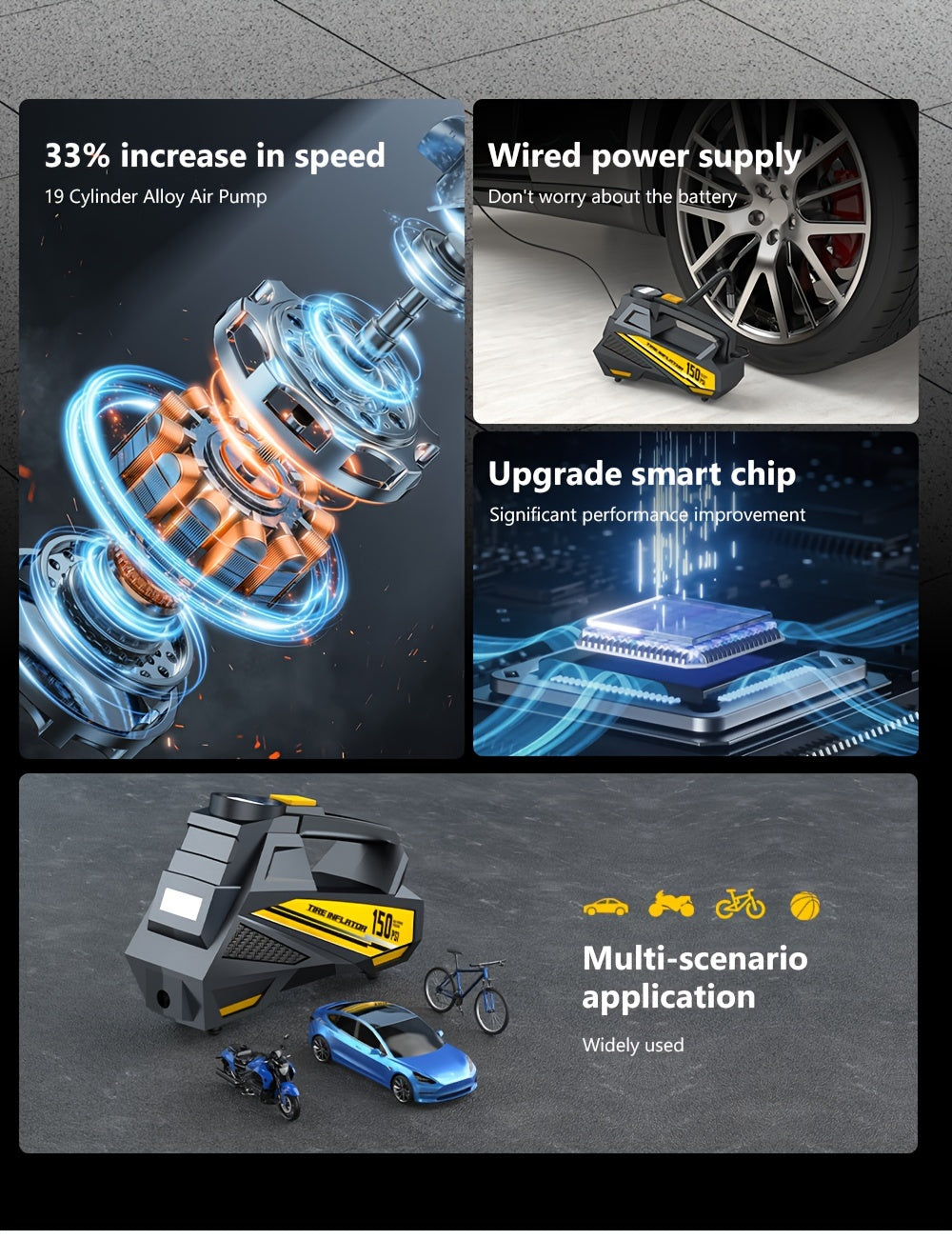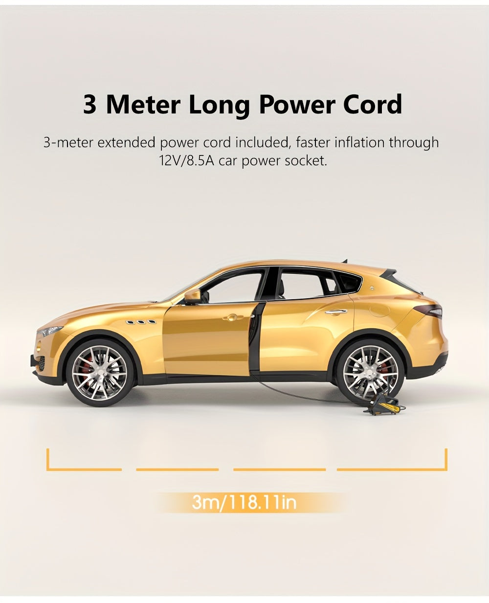 Inflador de pneus digital CaRSun, bomba de ar portátil com luz LED para automóveis, motos e bicicletas - DC 12V, 150 PSI, design preto e amarelo, alimentação por ficha, sem necessidade de bateria, insuflador de pneus de bicicleta | Porta elegante