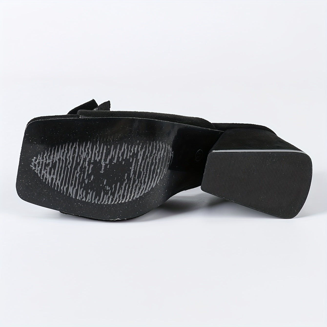 Chinelo feminino chique para o verão - Mules pretos de salto grosso e bico aberto, chinelos femininos de malha com salto alto e bico quadrado, com sola de borracha confortável.