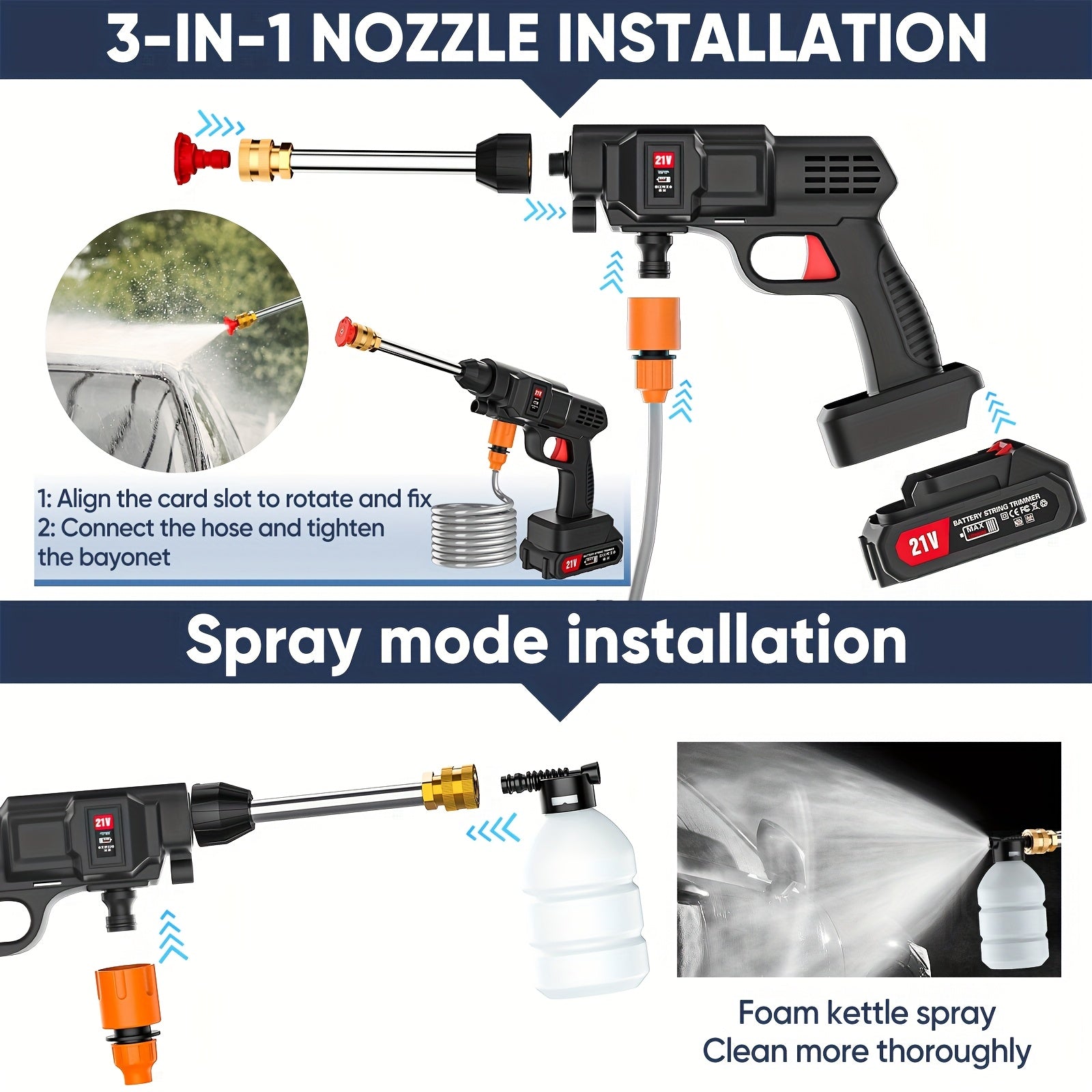 Pistola de limpeza de alta pressão sem fios, auto-ferrante, com jato contínuo de espuma, mangueira de 5 m e 2 pilhas de lítio recarregáveis, bocal 3 em 1, lavadora elétrica portátil, ideal para lavar automóveis, limpar jardins e pavimentos.