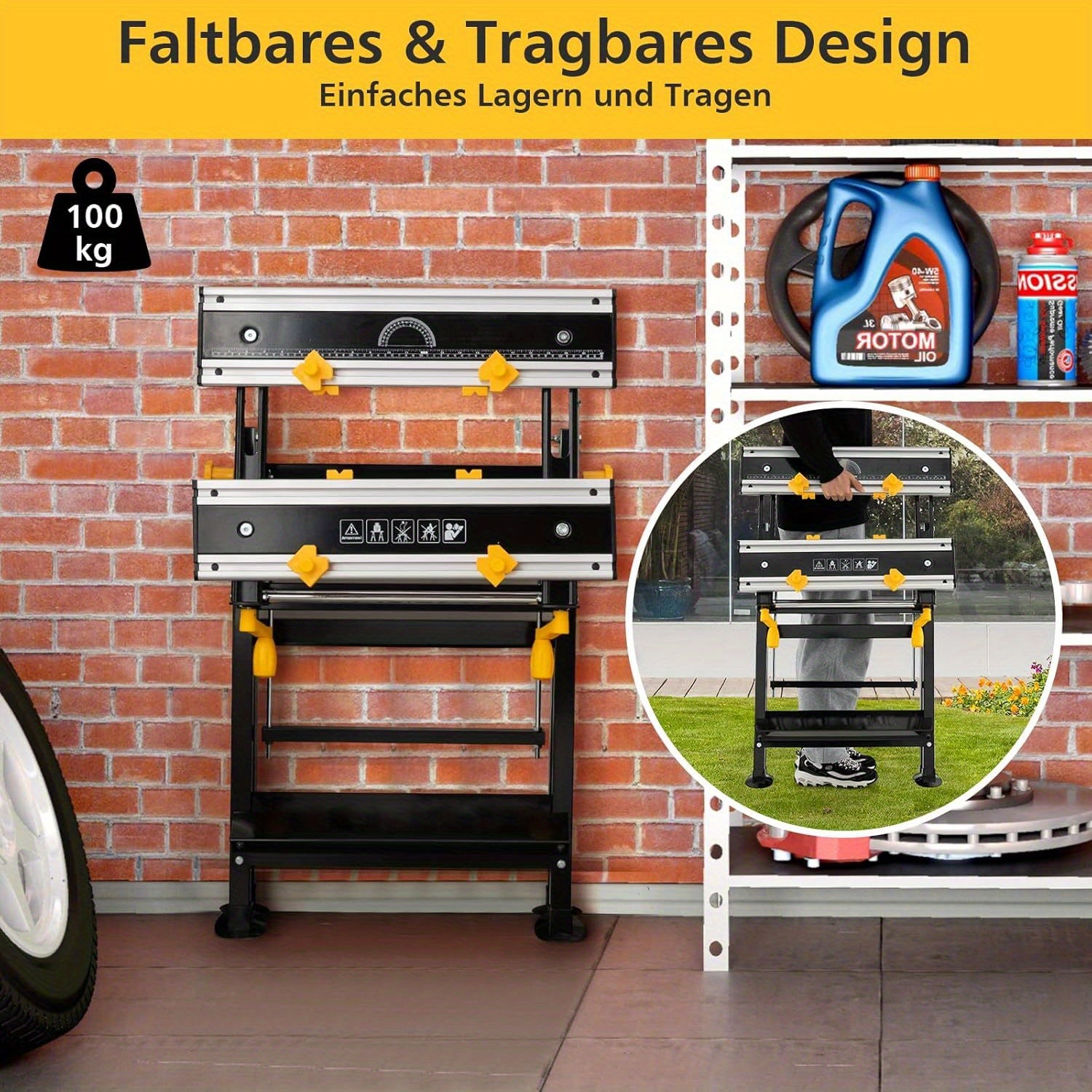 Heavy-Duty Folding Workbench with Adjustable Height & Tilting Platform, 7-Step Height Adjustment, Quick-Release Foot Pedal, Extendable Table Top (30-48cm), 8 Sliding Non-Damaging Clamps, Protractor & Ruler, Metal Frame for Wo