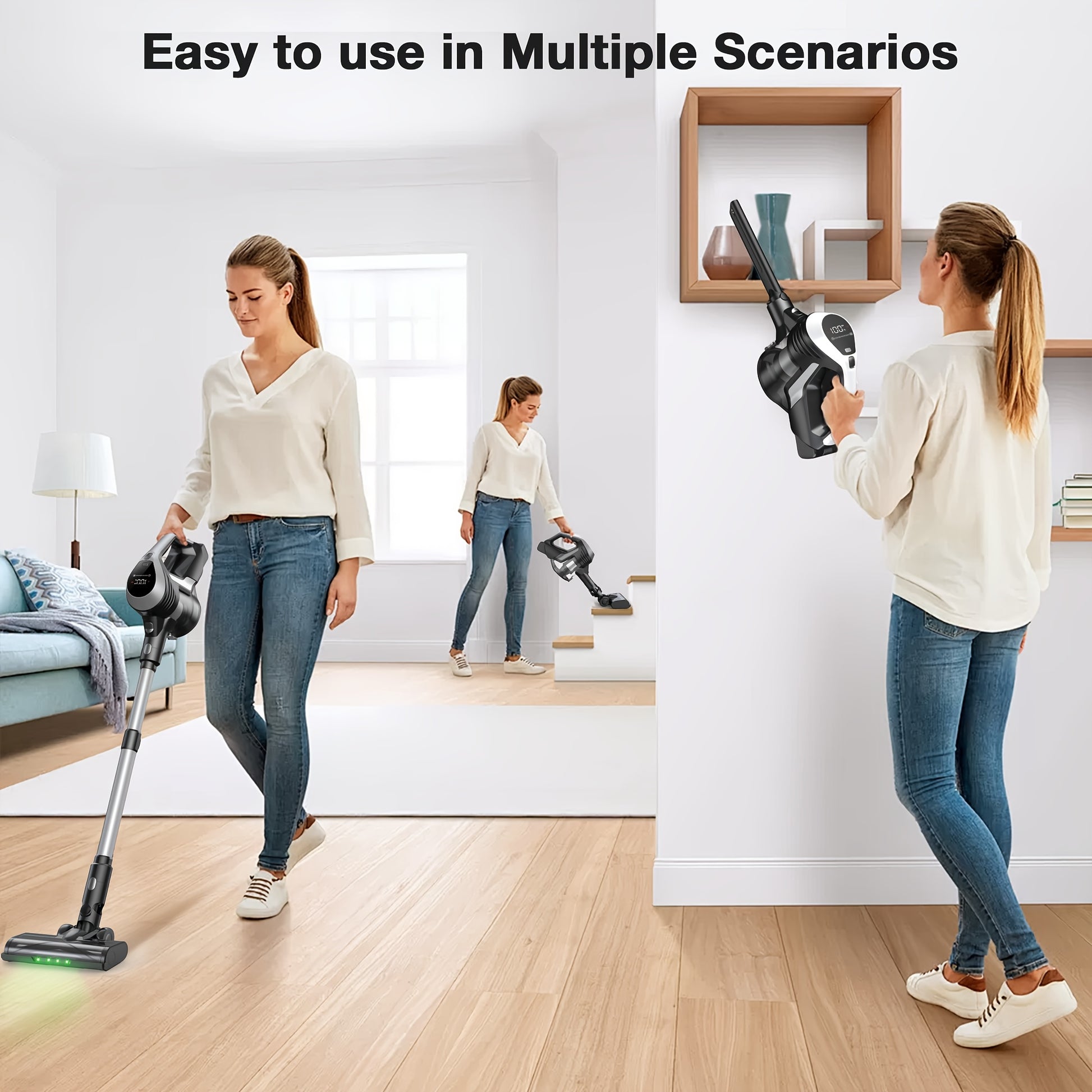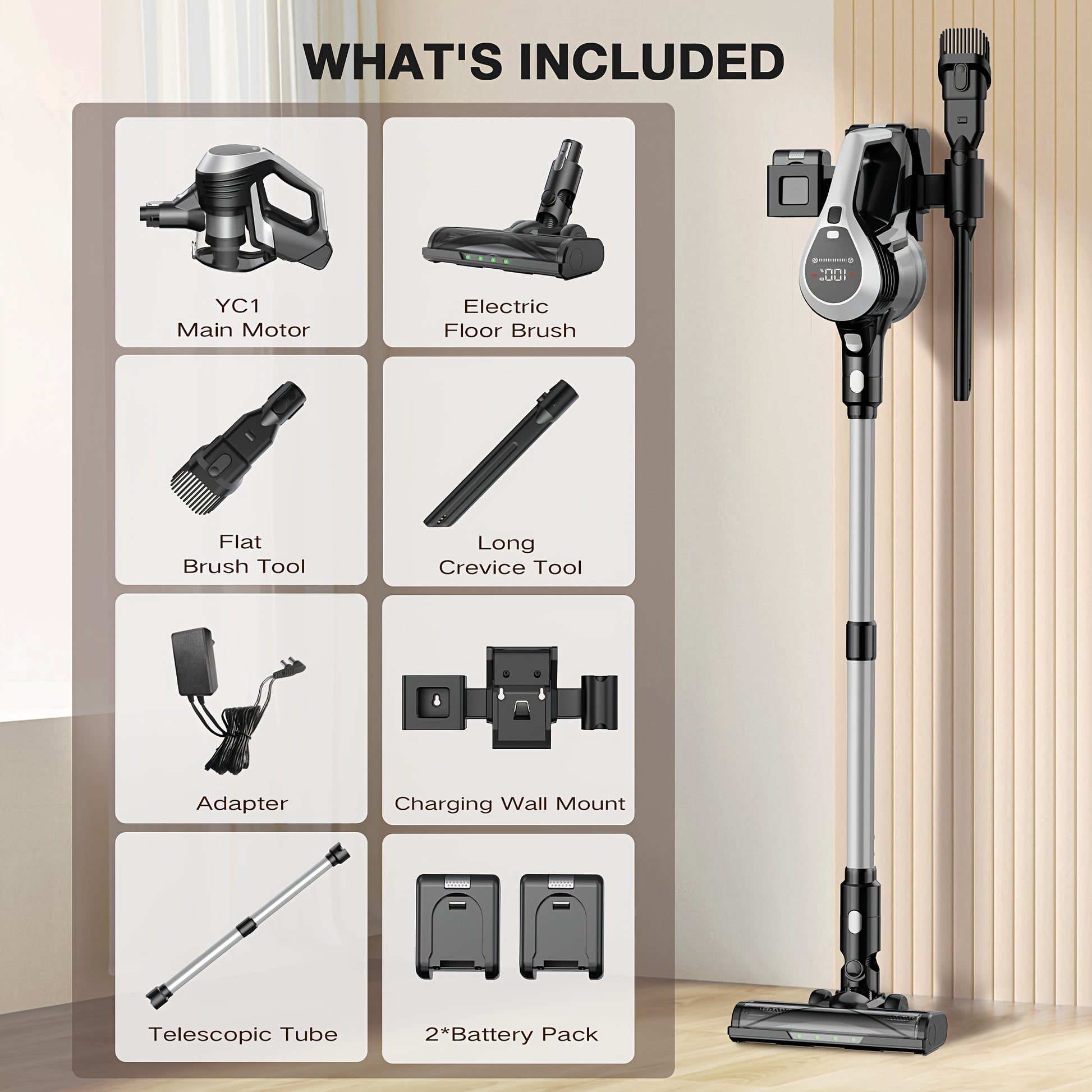 Aspirador sem fios MOOSOO YC1 Pro com visor LED, 2 baterias, design vertical leve 6 em 1, alta sucção para carpetes, pavimentos duros e pelos de animais, cabo ergonómico, construção durável, aspirador sem fios, auxiliar de limpeza doméstica.