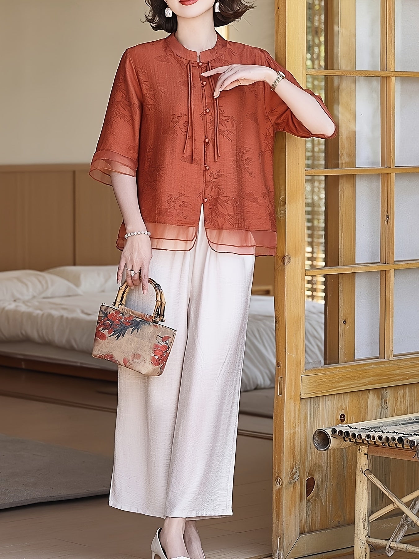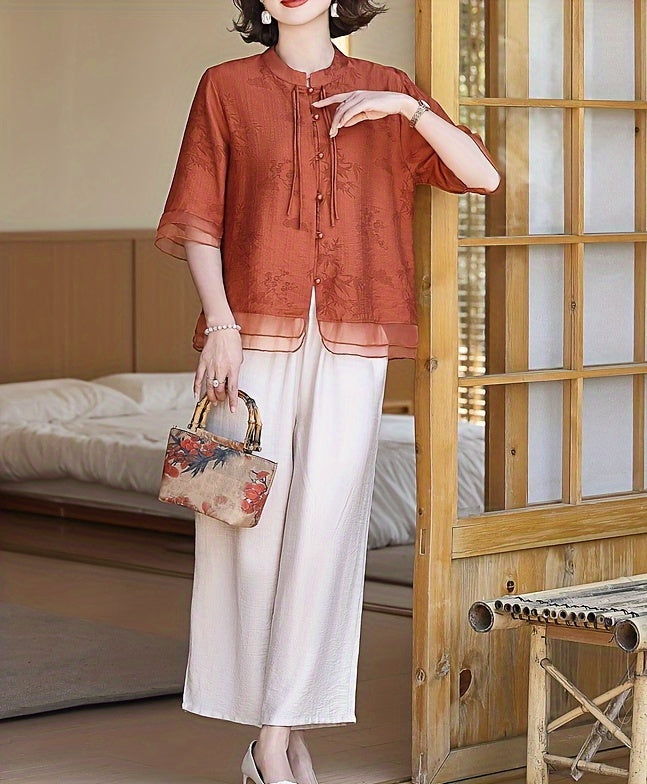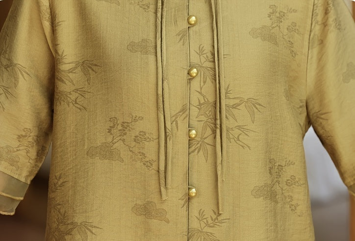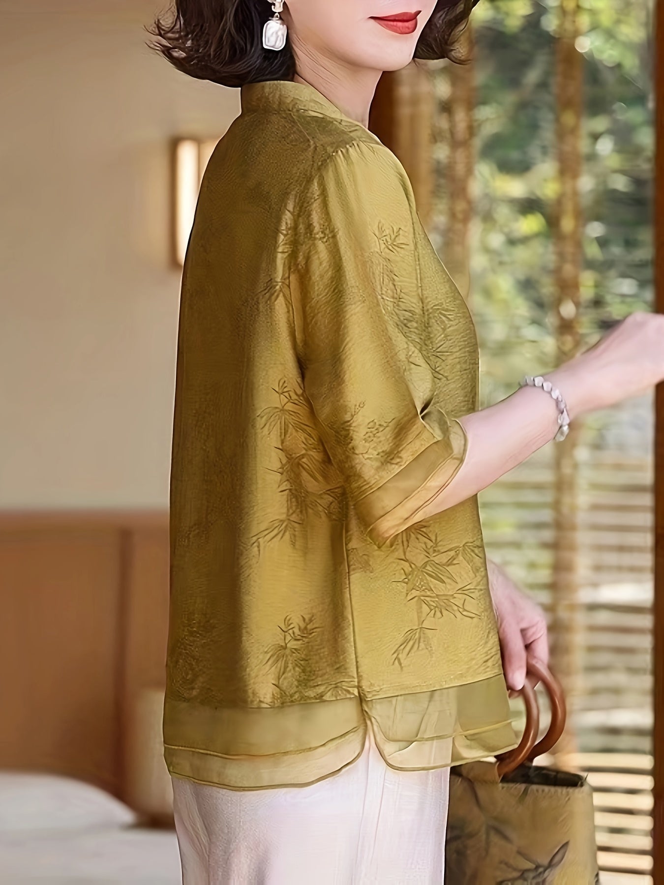 Elegante blusa de verão para mulher com estampado floral - Manga curta, gola mandarim, corte largo, verde-azeitona claro, perfeita para looks casuais. Blusa casual | Blusa com estampado floral | Camisola com gola mandarim